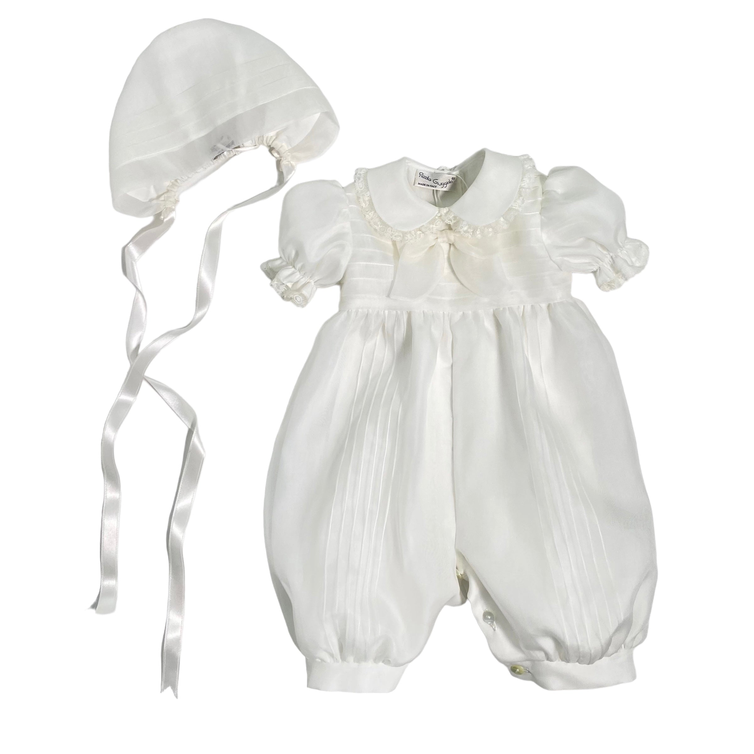 Pagliaccetto elegante in organdis di seta, in tinta unita avorio, con colletto tondo con pizzo, manica a sbuffo e applicazione di fiocco sul davanti.