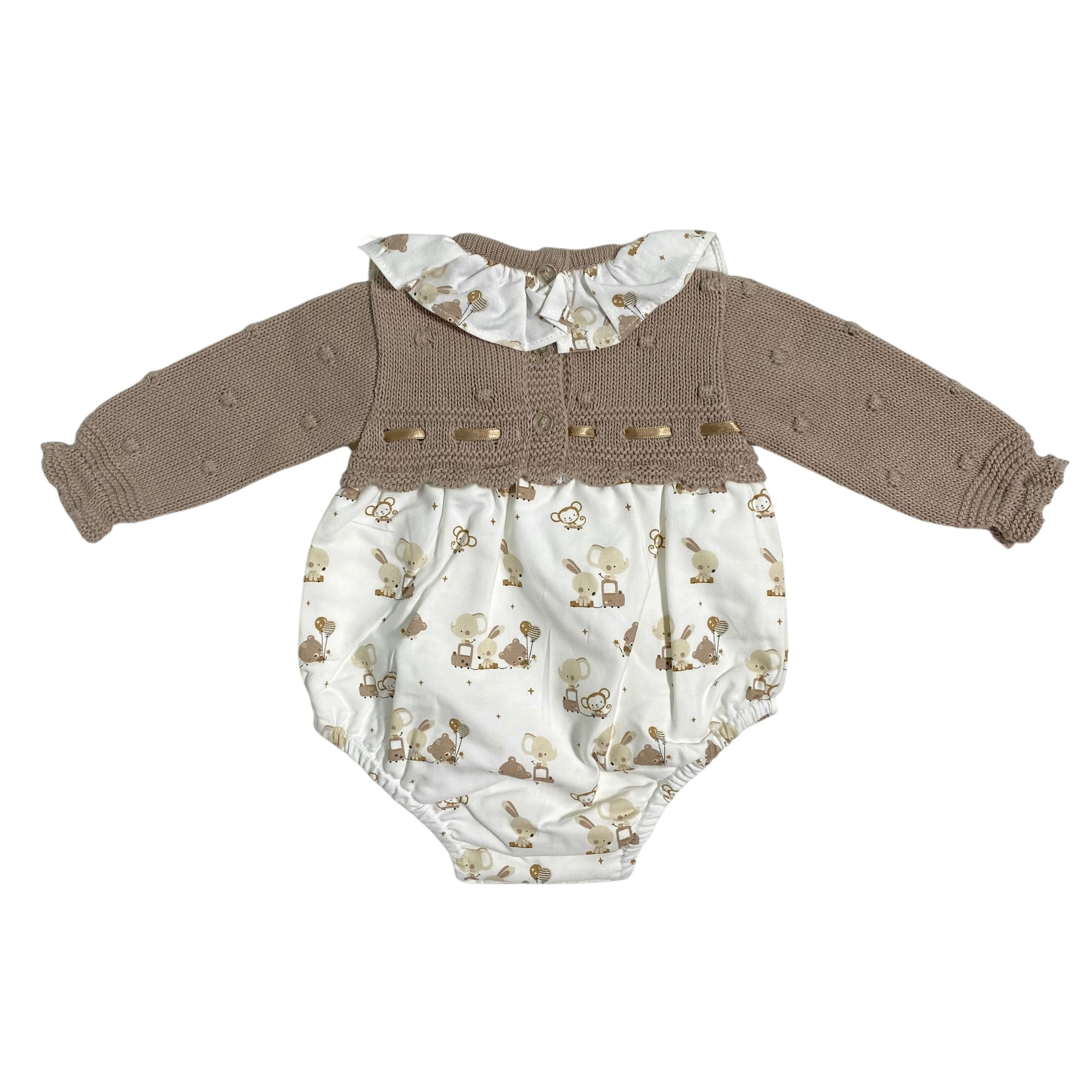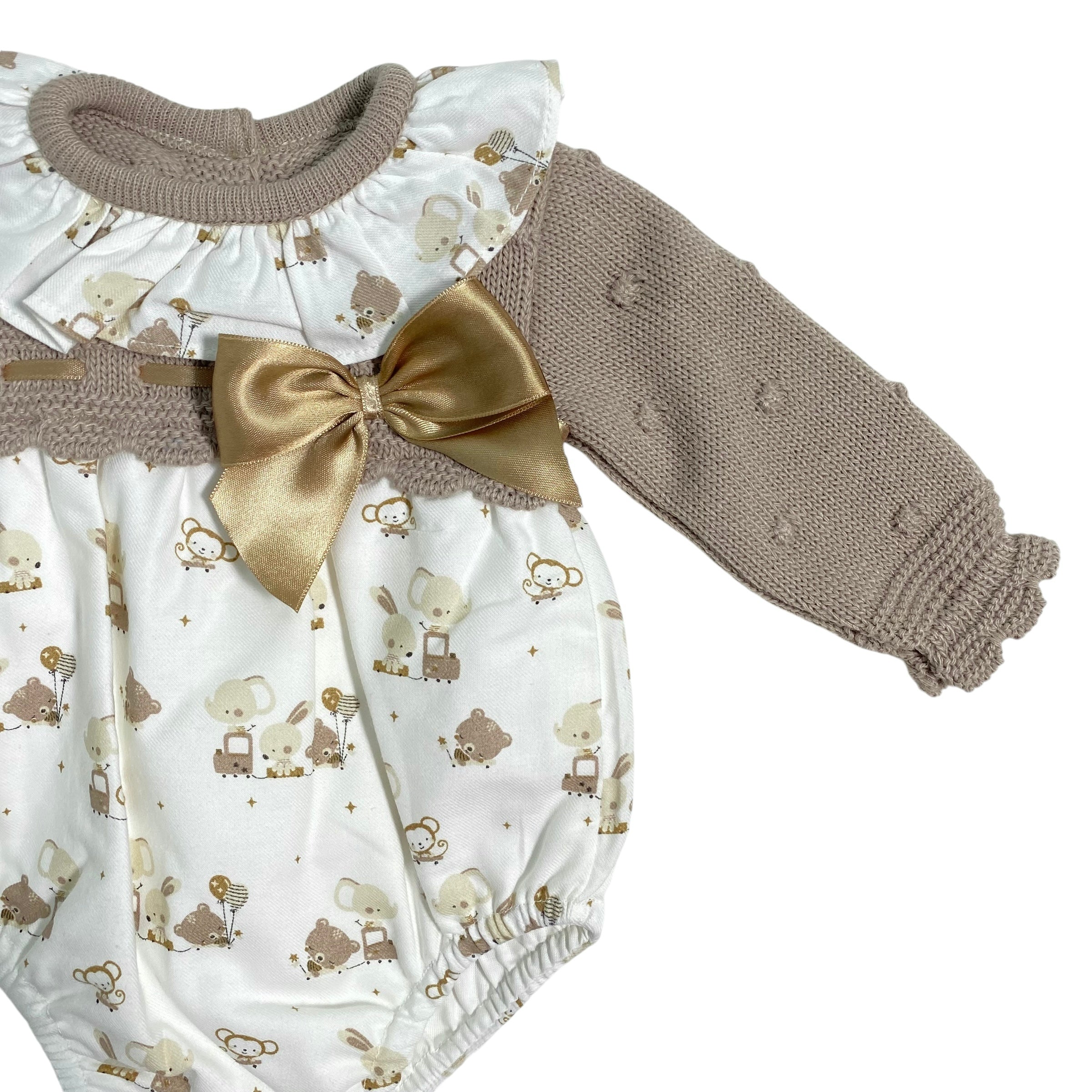 Questo pagliaccetto combinato e' perfetto per la tua neonata! Il corpetto in maglia offre comfort, mentre il tessuto stampato aggiunge un tocco di stile. Il collo arricciato e il fiocco in raso sul petto rendono questo capo elegante e sofisticato. Aggiungi un tocco di classe al guardaroba della tua piccola con Pagliaccetto Combinato In Maglia E Tessuto Neonata BABY FASHION.