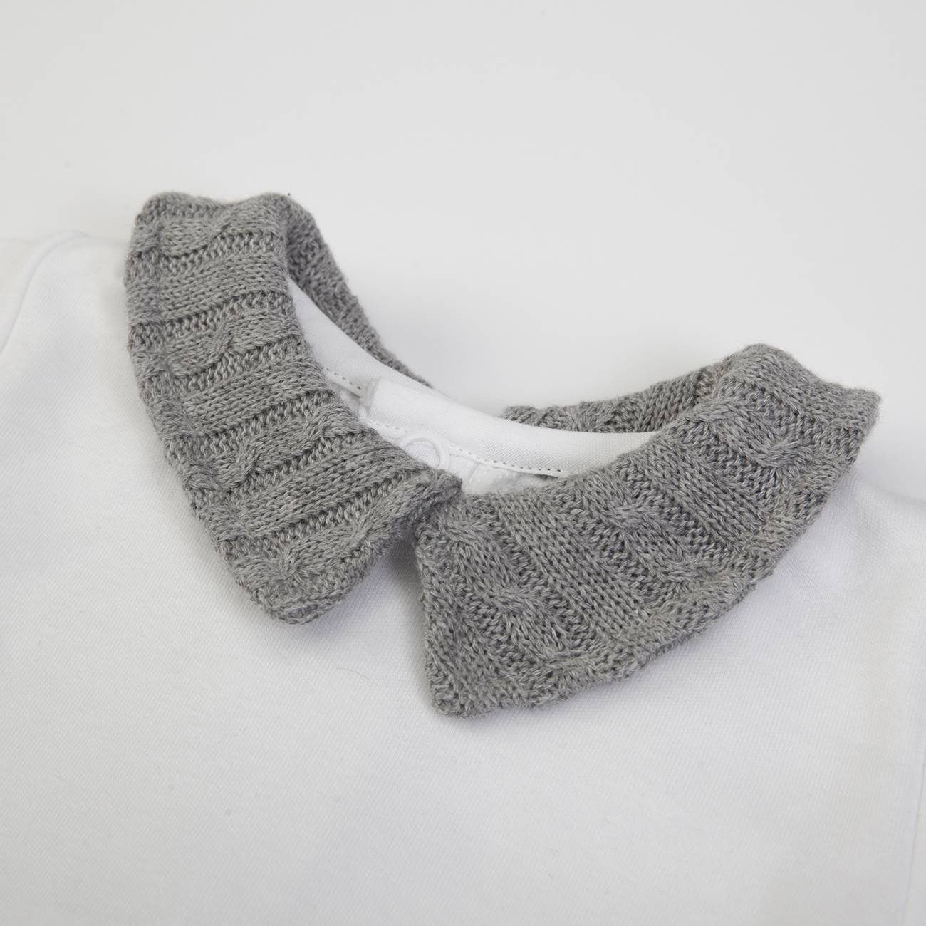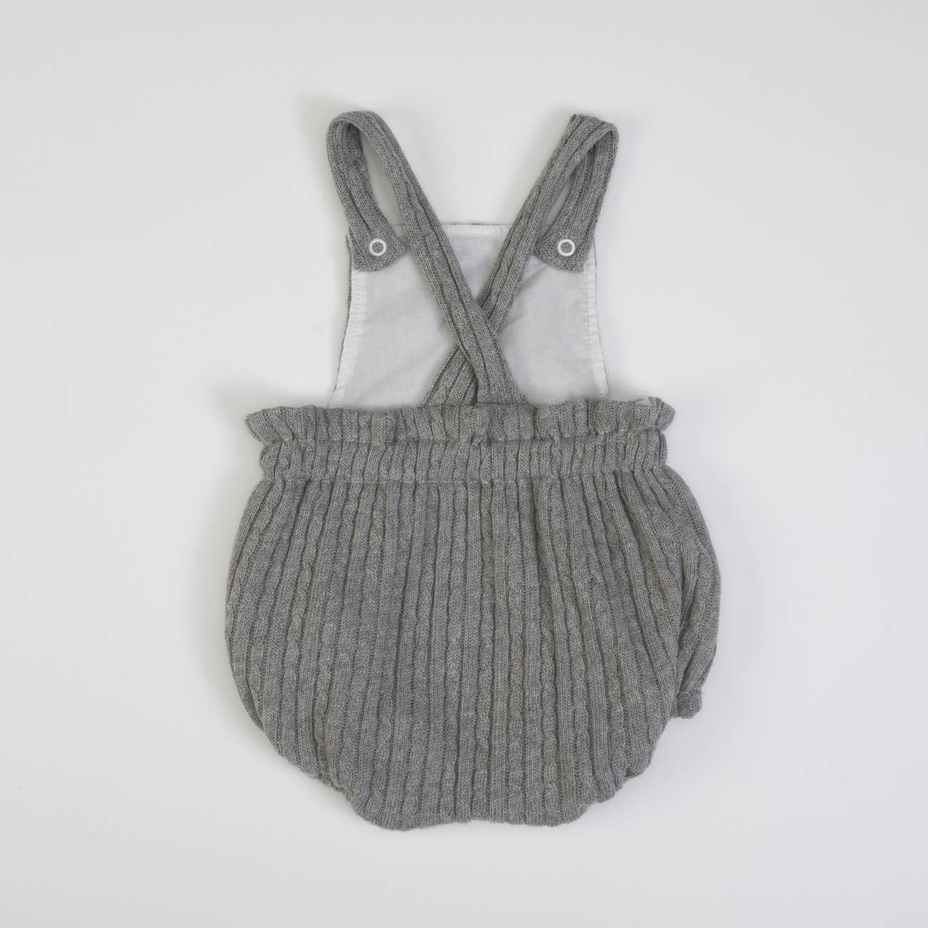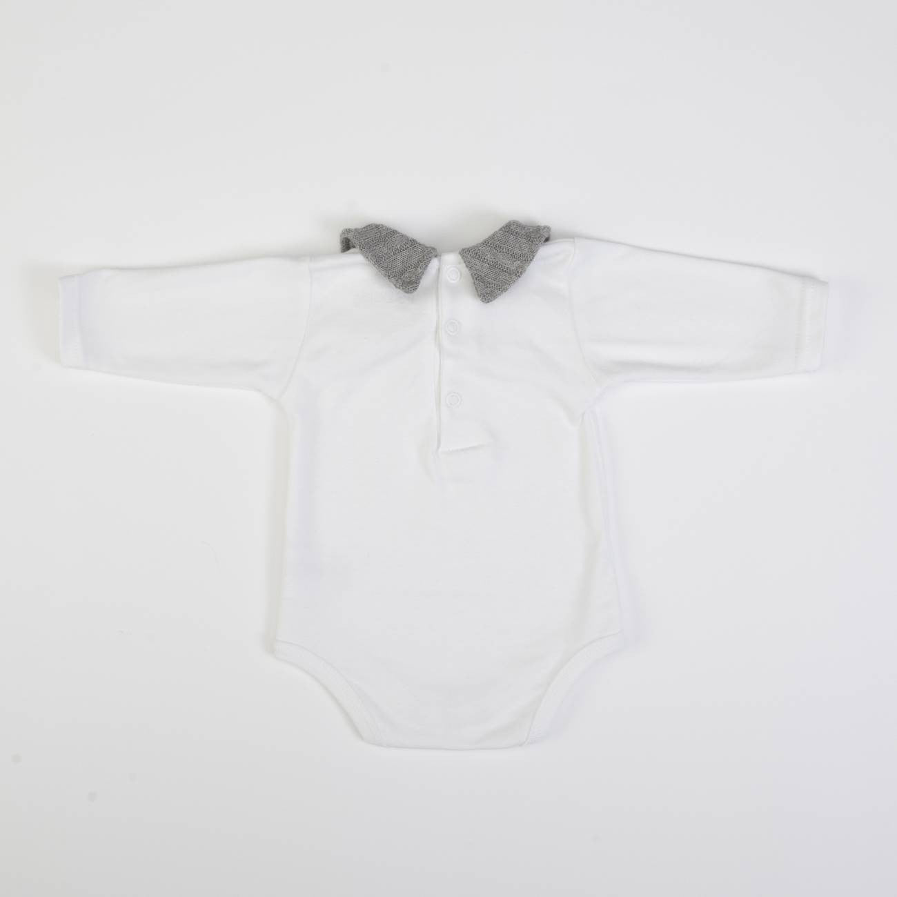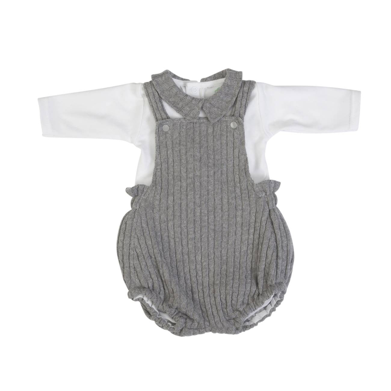 Pagliaccetto in lana con elastico in vita e alle gambe e body bianco con colletto in lana, maniche lunghe e bottoni sul retro.