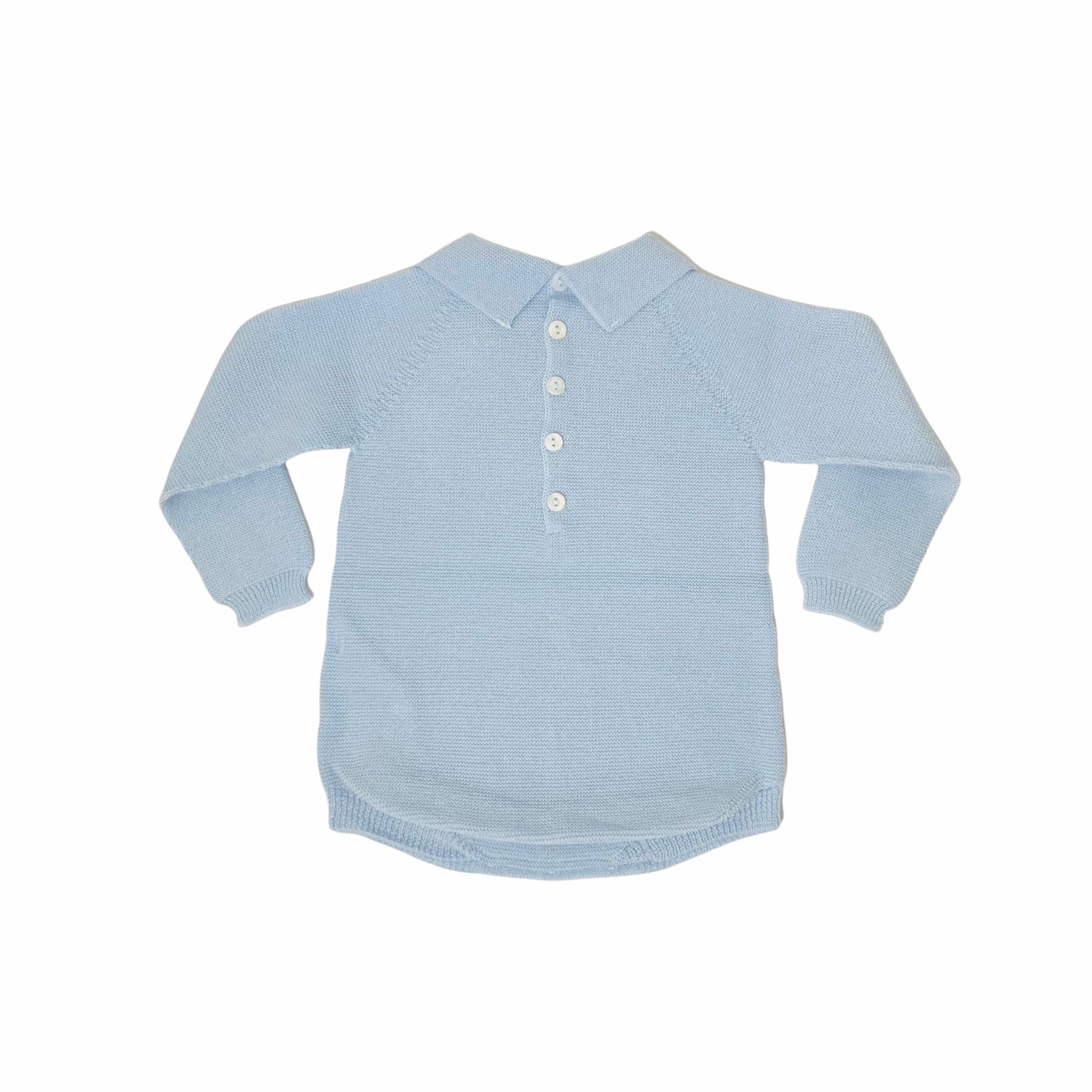 Pagliaccetto in 100% lana, morbida e calda, con colletto, maniche lunghe, chiusura sul retro e al cavallo con delicati ricami sul davanti.