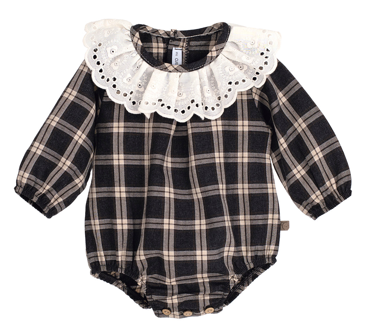 Questo pagliaccetto in caldo cotone a quadri per neonata unisce comfort e stile. La manica lunga e il tessuto morbido garantiscono calore e protezione, mentre il collo con rouches aggiunge un tocco elegante e raffinato. Perfetto per le giornate più fresche, è una scelta alla moda che valorizza ogni occasione.