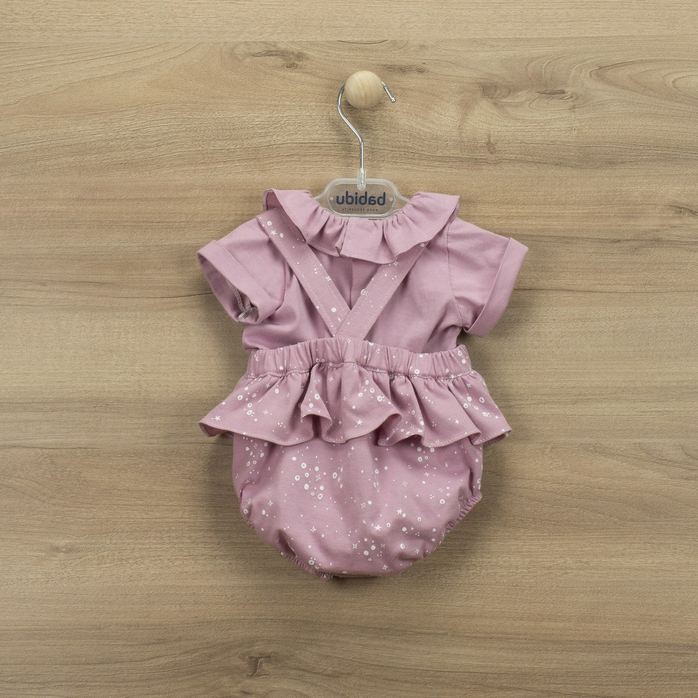 Pagliaccetto in cotone color rosa antico con bretelle con chiusura intrecciata sul retro con dei bottoncini in legno.