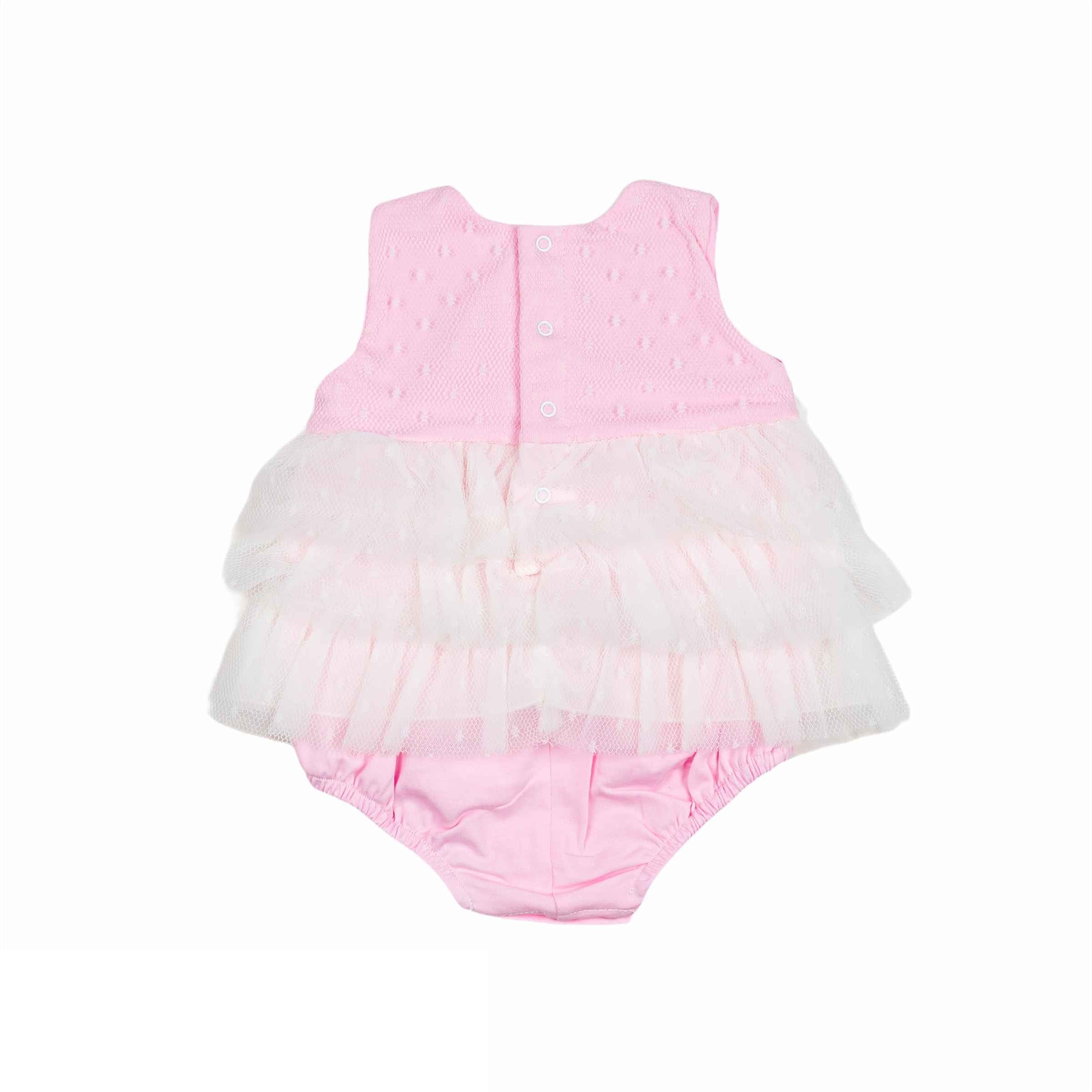 Pagliaccetto In Cotone Rosa, Giro Manica, Con Balze In Tulle Ed Applicazioni Di Roselline Bianche.