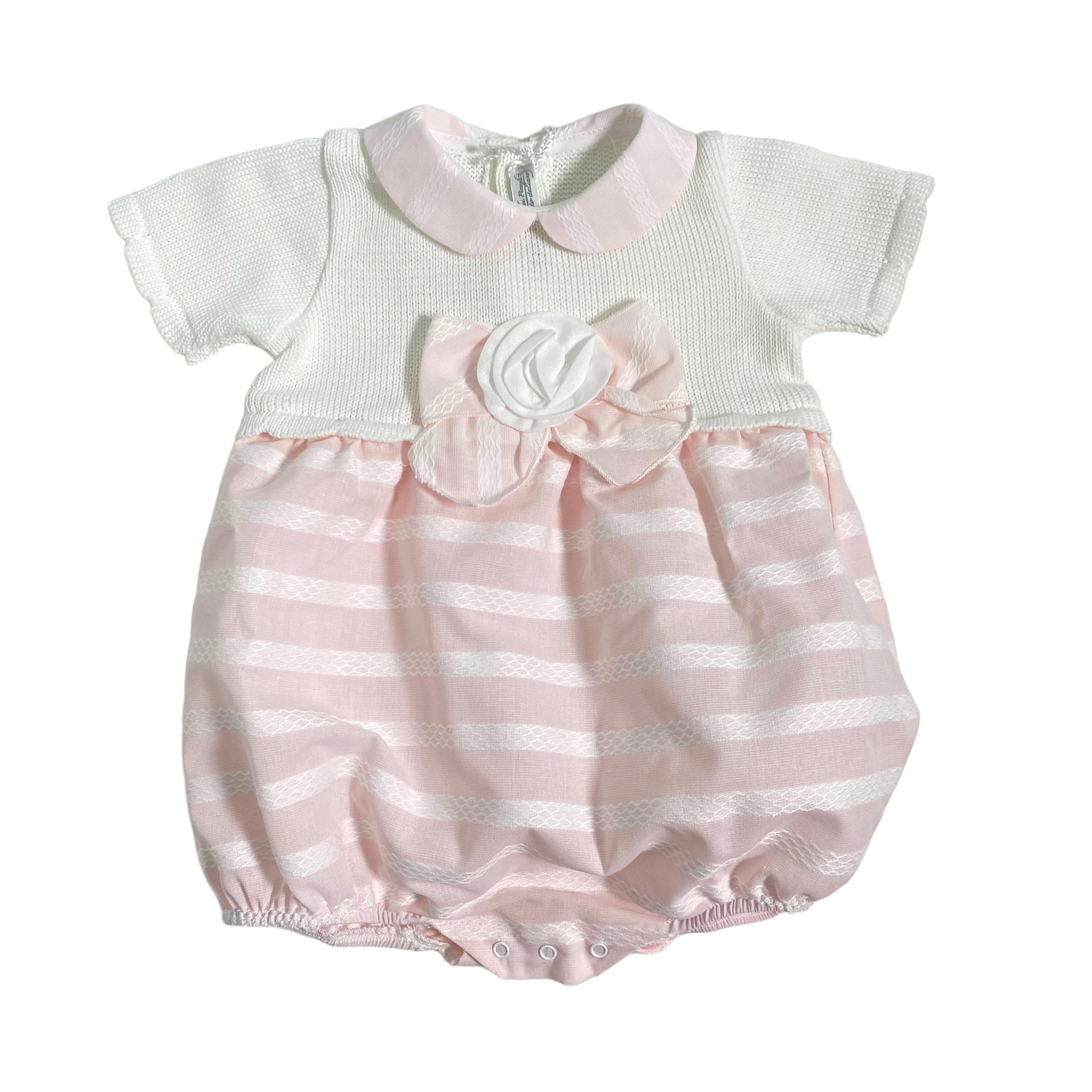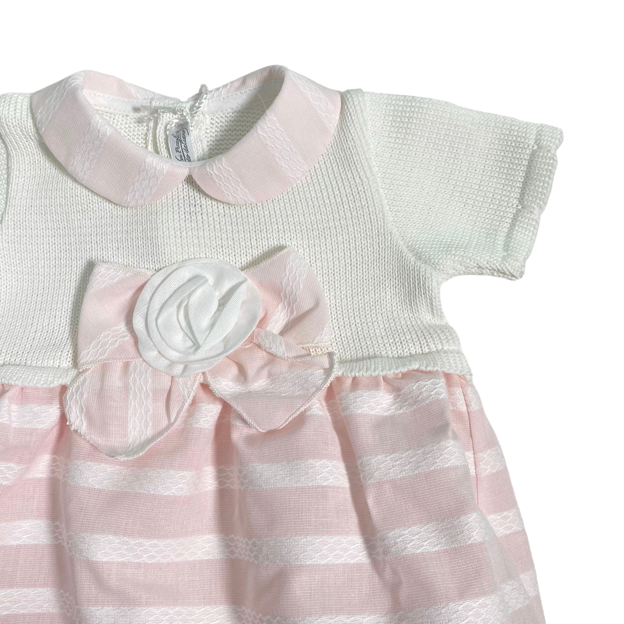 Pagliaccetto con corpetto in filo di cotone bianco e parte sottostante in tessuto operato rosa.