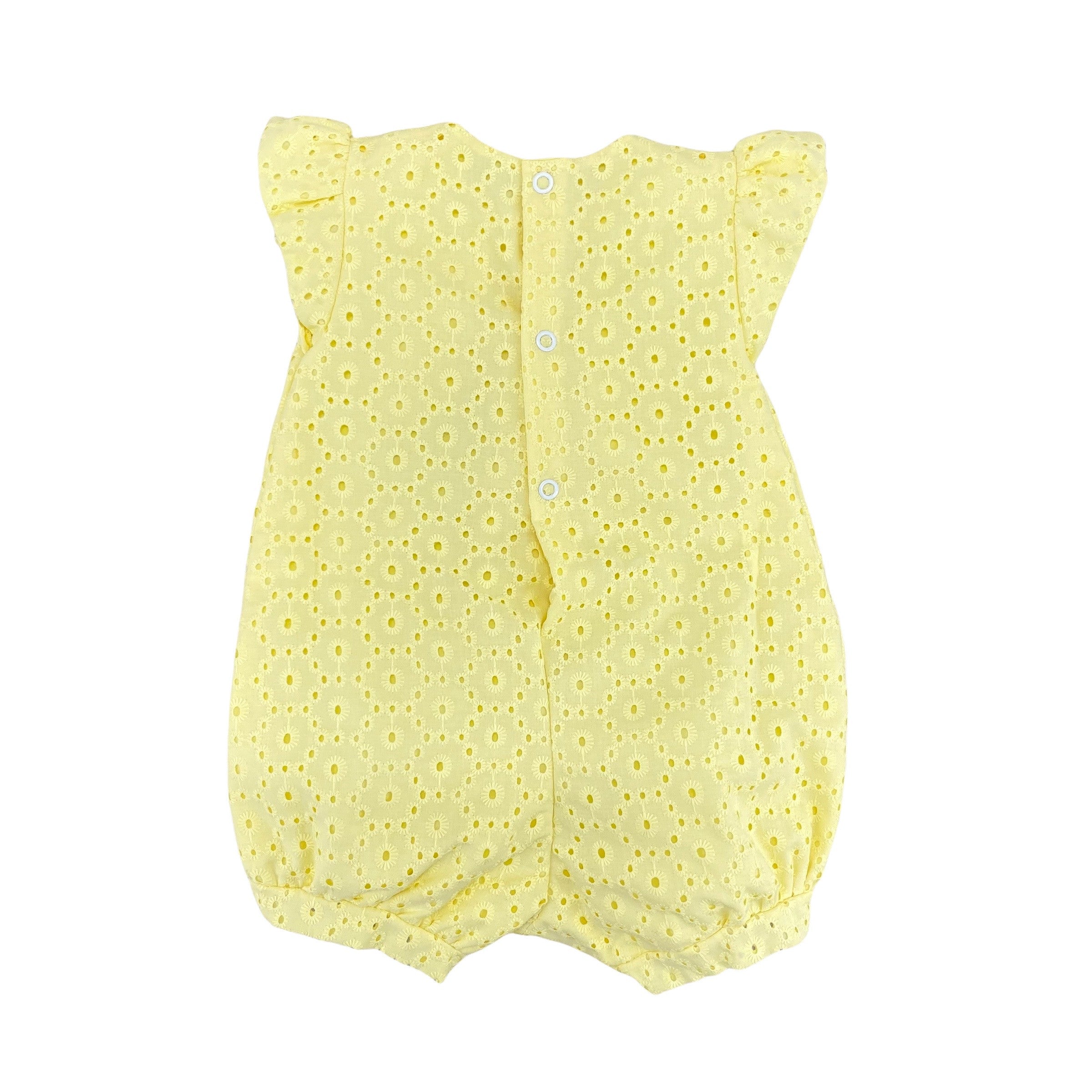 Pagliaccetto intero in pizzo san gallo, in tinta unita giallo, con applicazione di fiocco sul davanti.