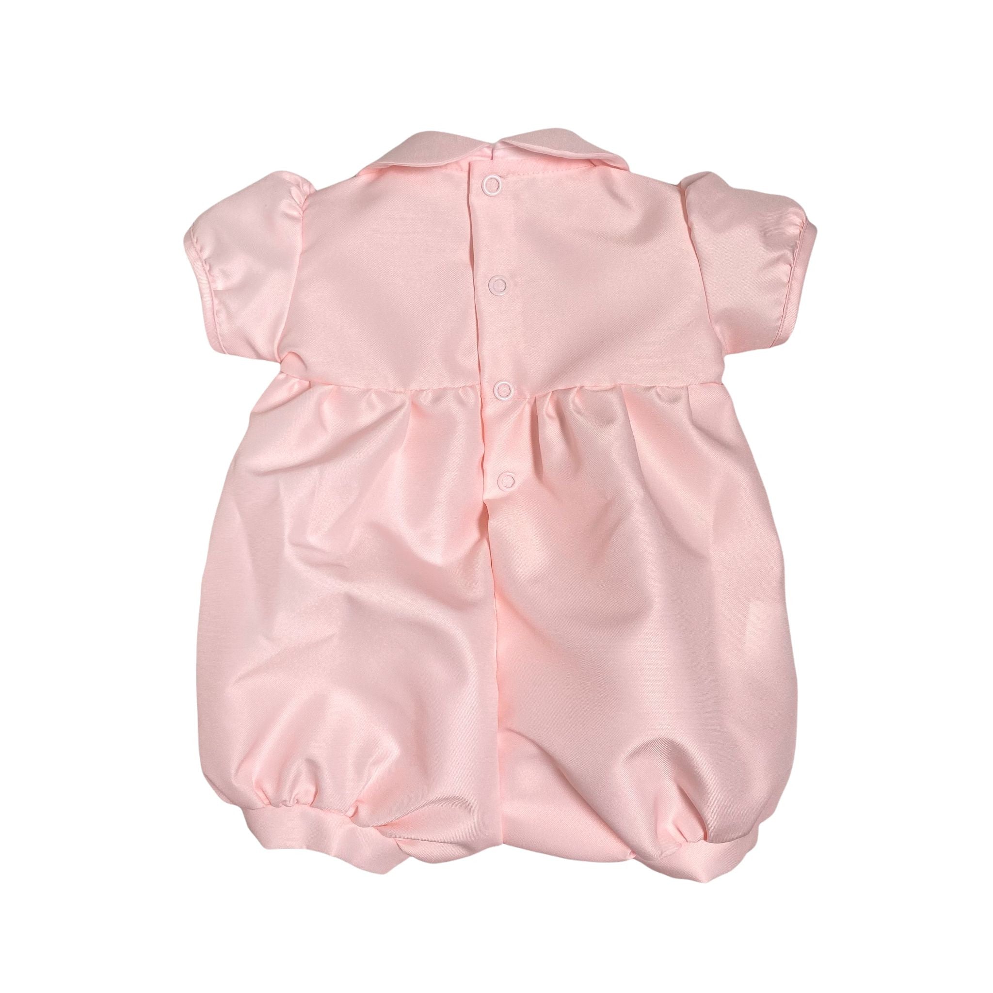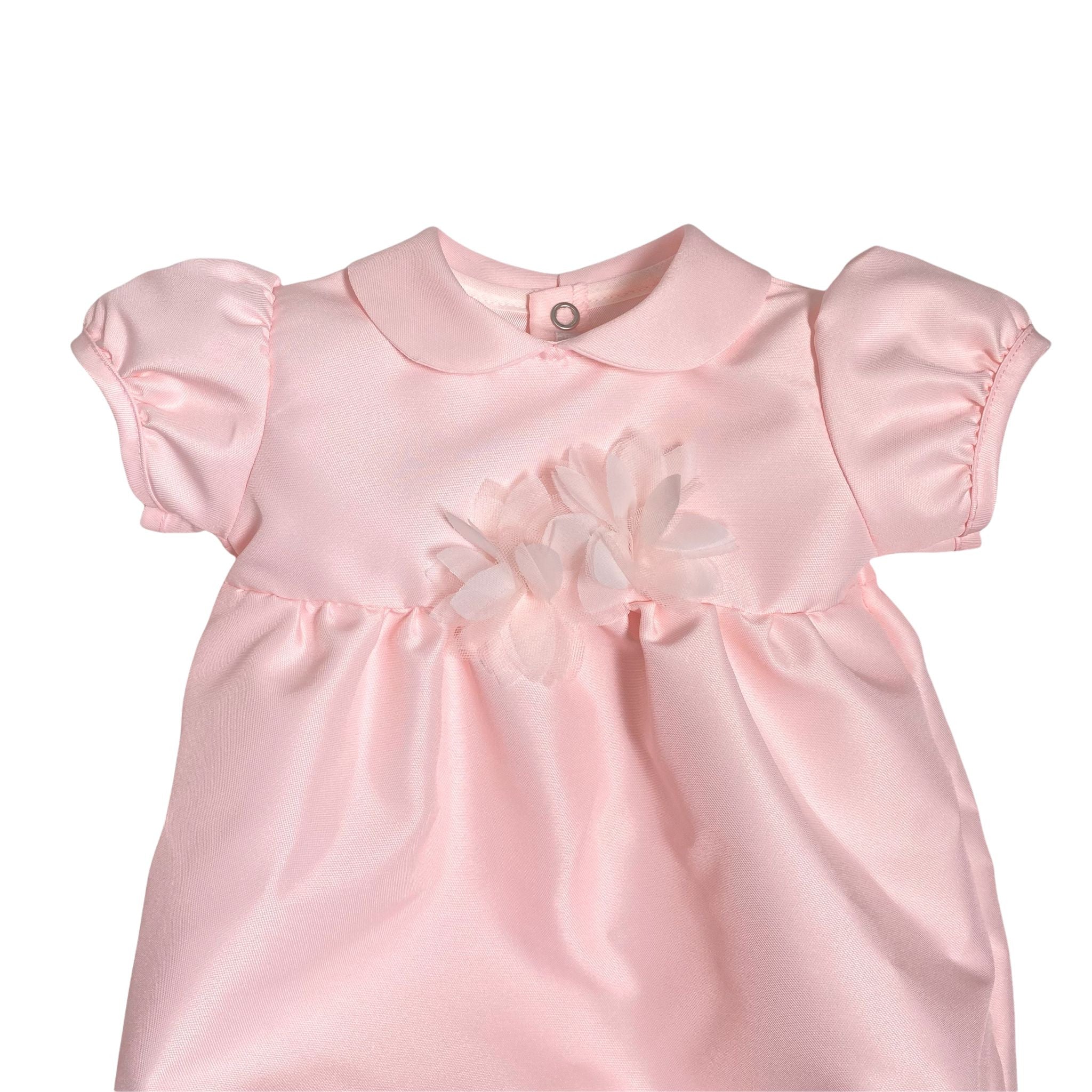 Pagliaccetto mezza manica in raso, in tinta unita rosa, con applicazione di fiore in tulle sul laterale.