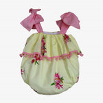 fiocchi rosa che si allacciano sulle spalle. Questa tutina è completamente foderata in
