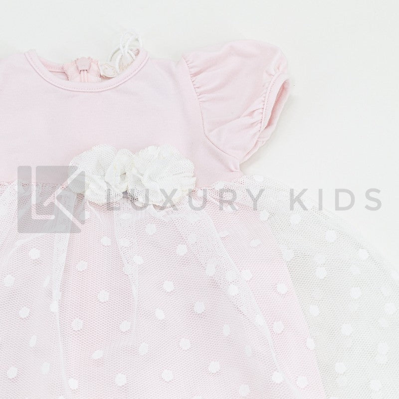 Pagliaccetto spezzato in cotone tinta unita rosa, con applicazione di balza di tulle a pois bianca e fiori bianchi in vita.