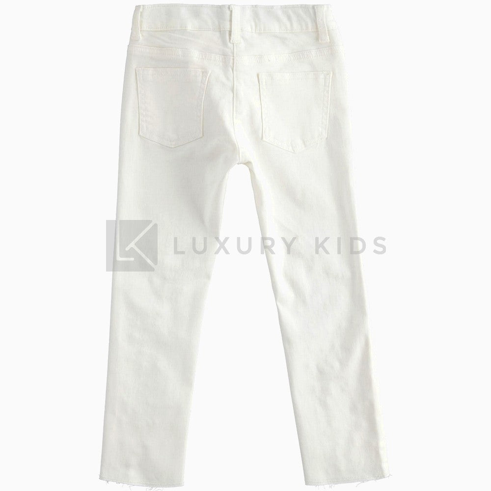 Pantalone lungo Sarabanda realizzato in twill stretch di cotone, molto morbido. Il modello è slim fit con la vita regolabile tramite elastico asolato. Il pantalone è illuminato da perle ed è corredato da un elegante portachiavi, utilizzabile anche separatamente. Il fondo è sfilacciato