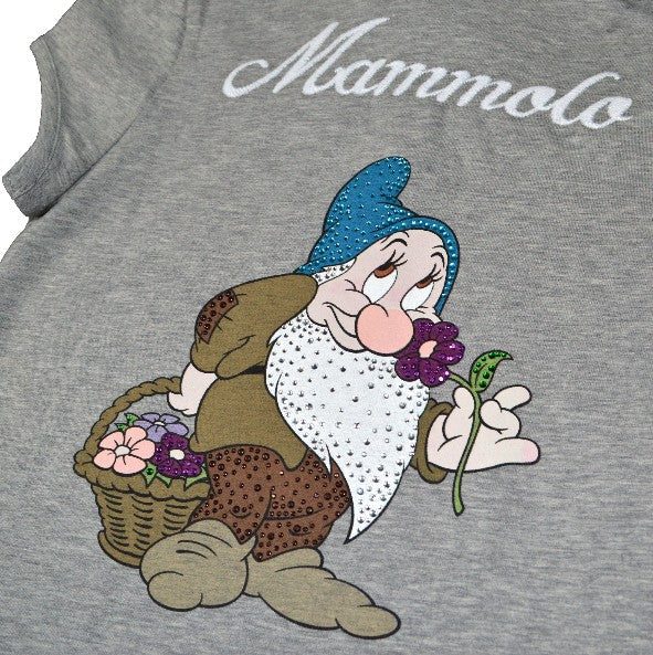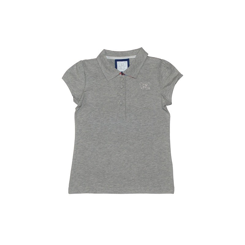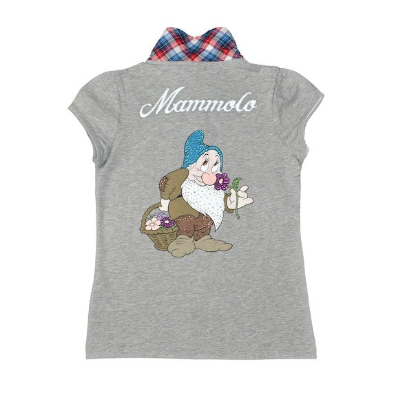 Polo in Tinta Unita in Cotone Grigio con Strass a Forma di Logo sul Petto, Stampa Mammolo e Strass sul Retro e Chiusura con Bottoni.