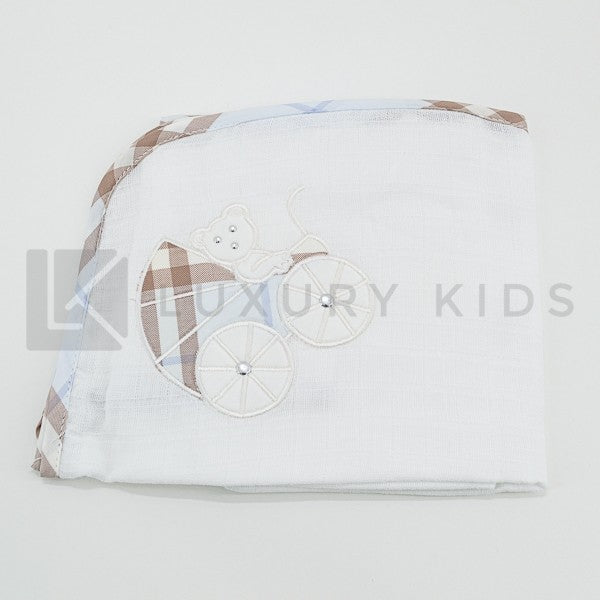 Quadrato di garza bianco con bordatura marrone e azzurra, con applicazione di patch carrozzina.