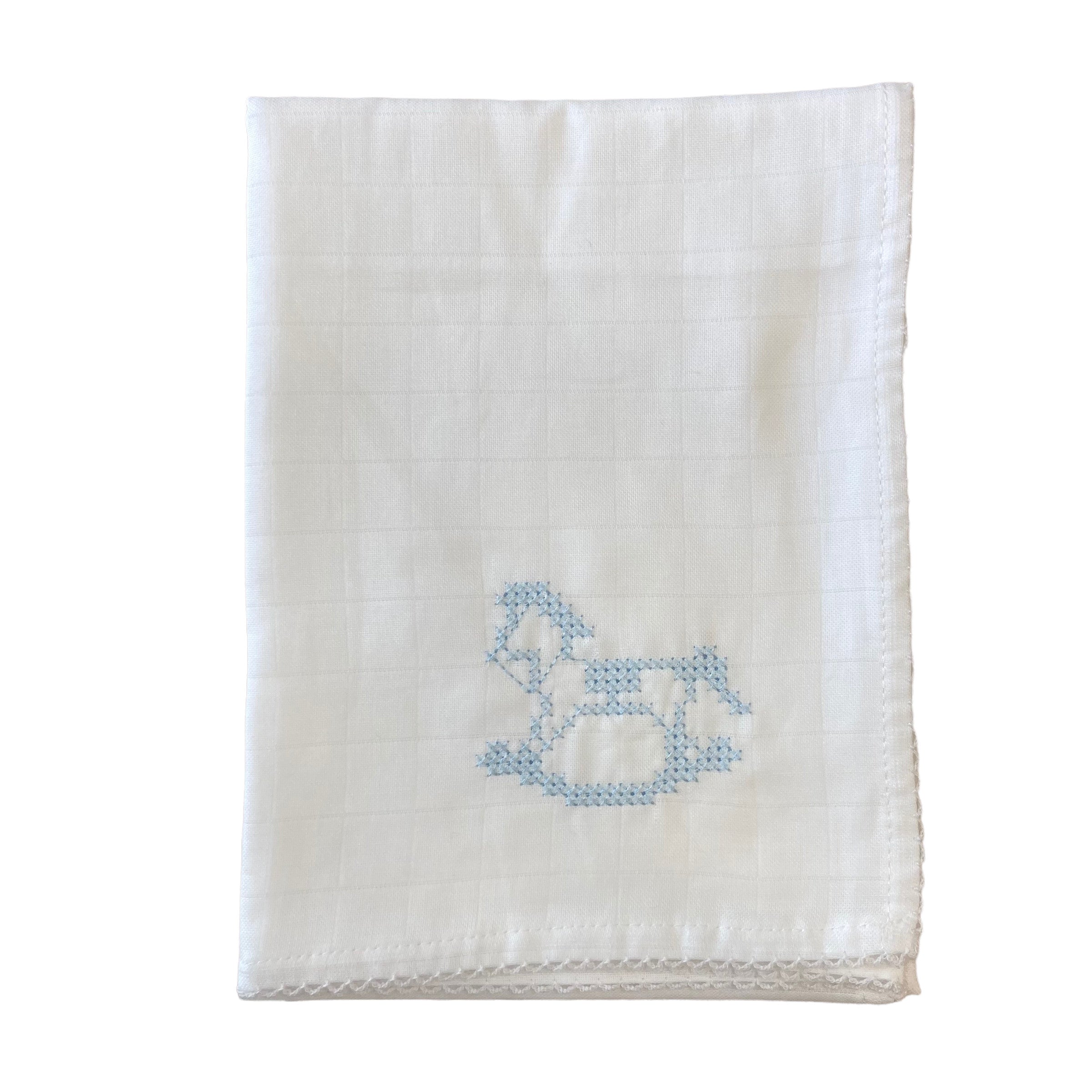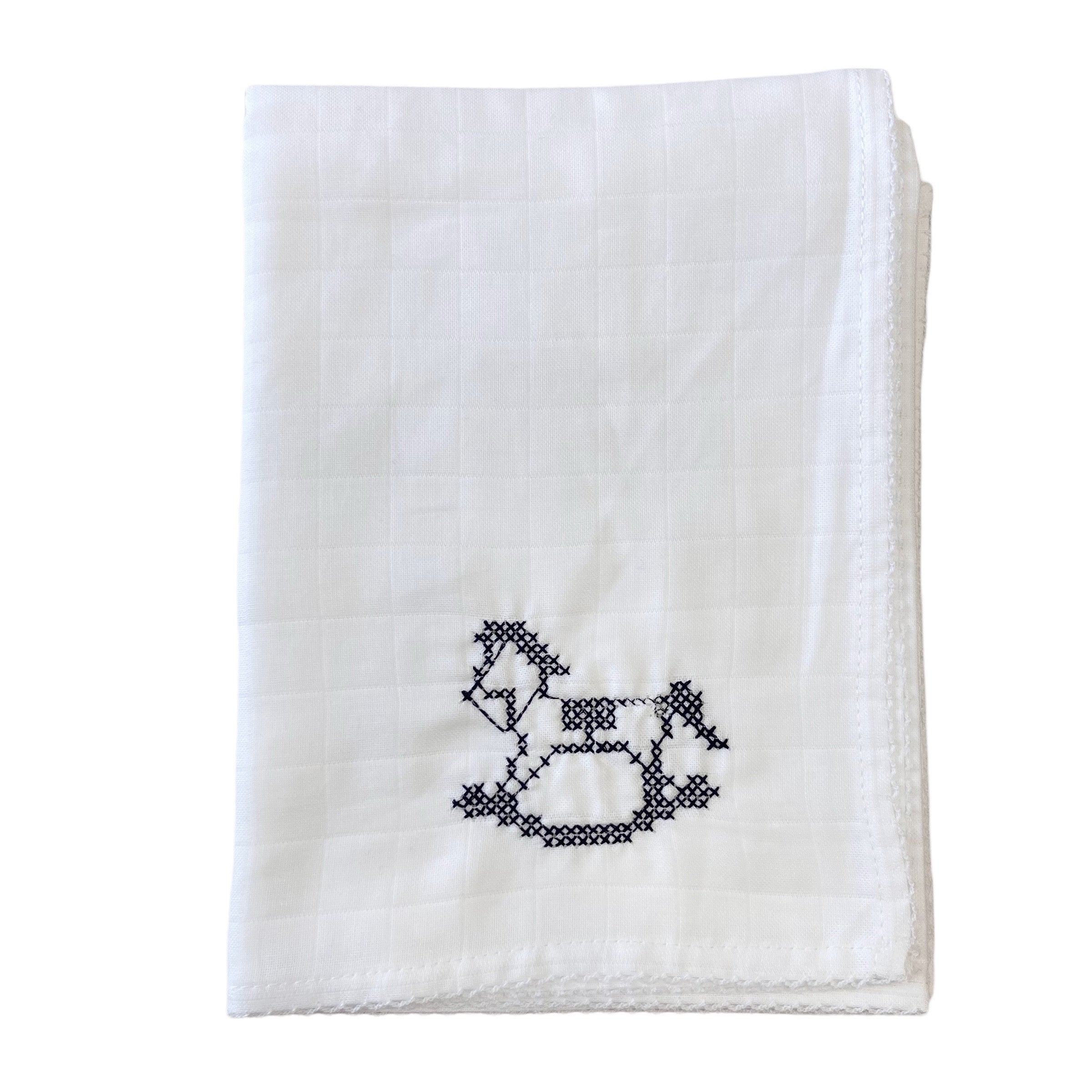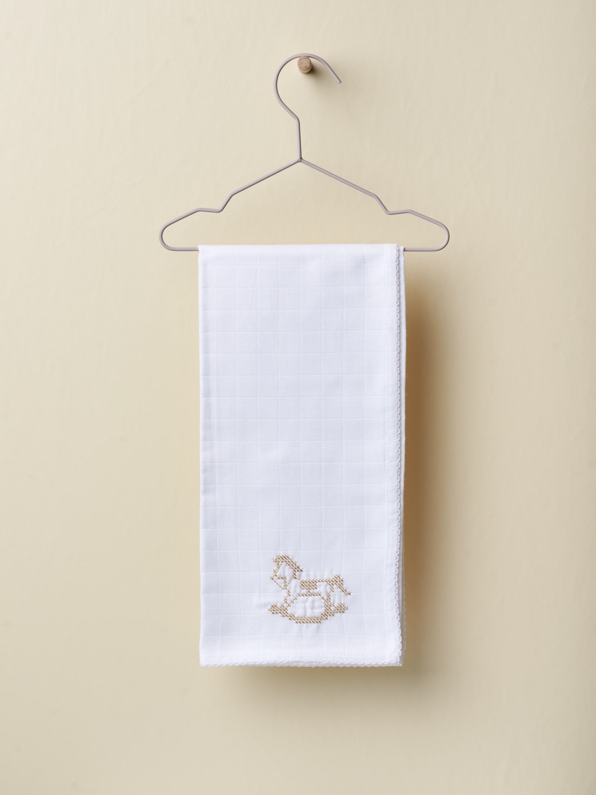 Quadrato di garza in fresco cotone con disegno di cavallo a dondolo ricamato per lui e lei e bordino rifinito con ricamo.