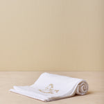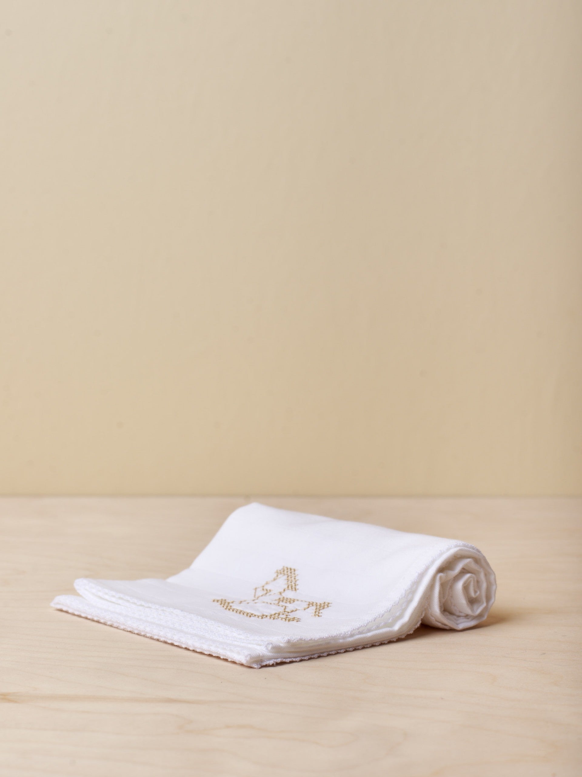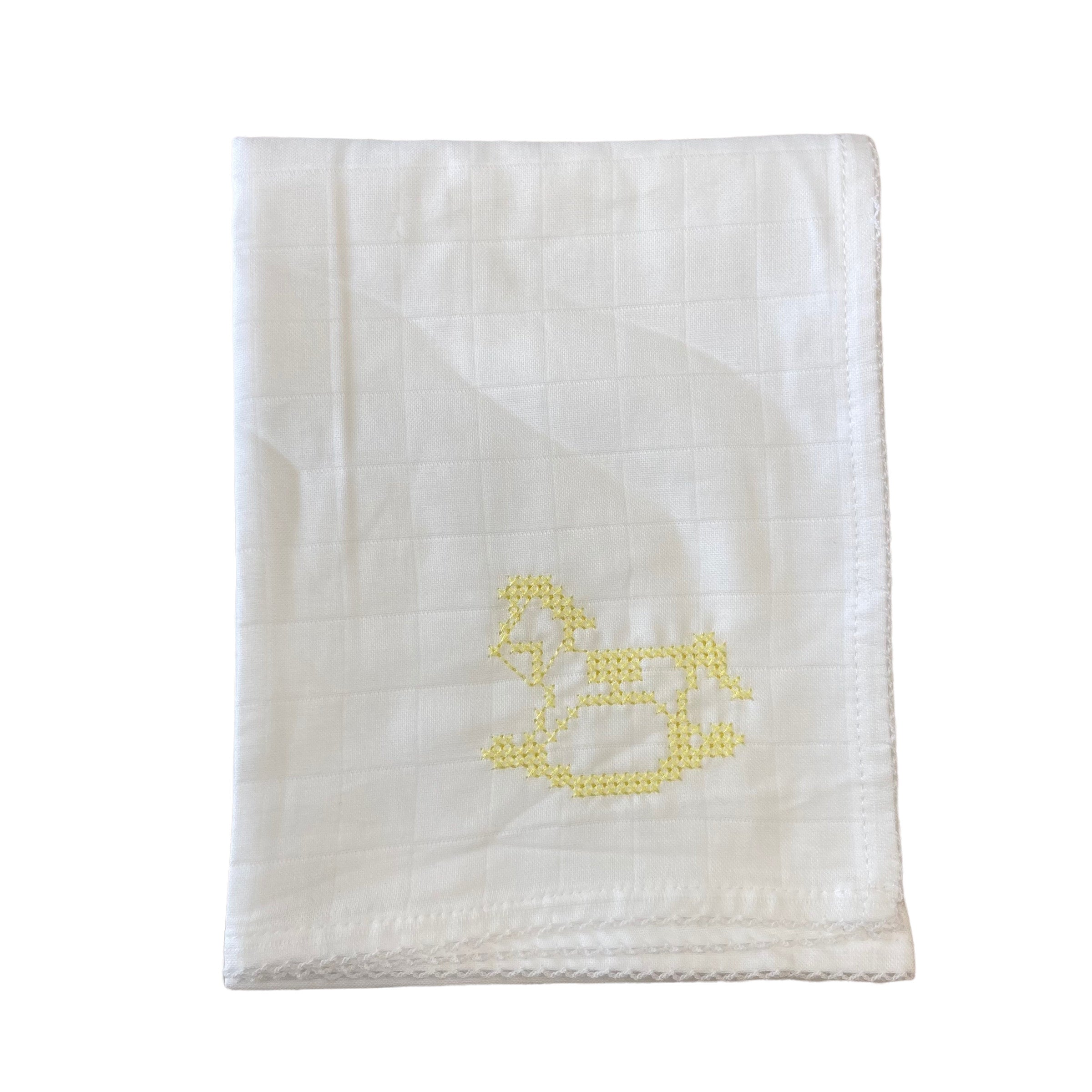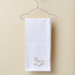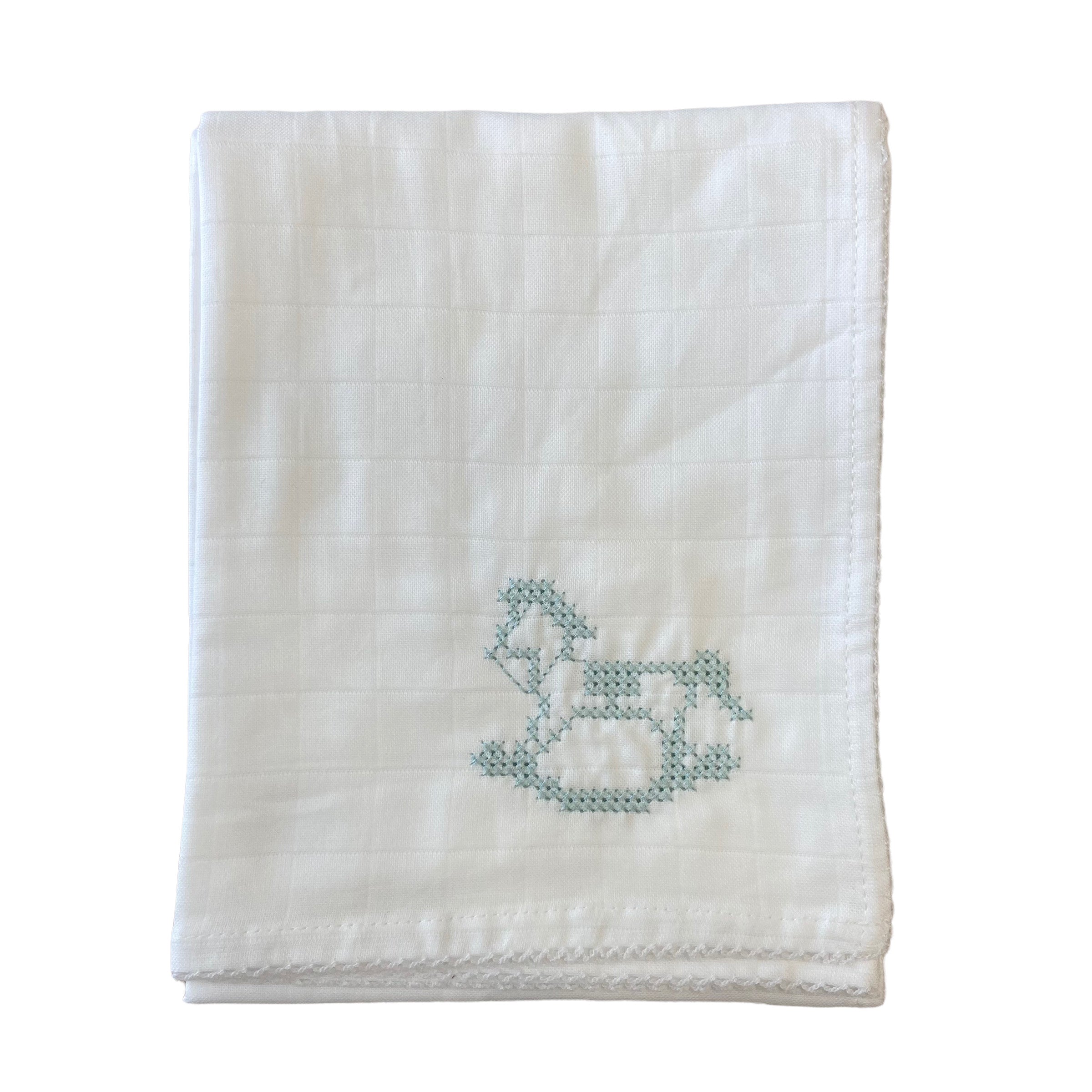 Quadrato di garza in fresco cotone con disegno di cavallo a dondolo ricamato per lui e lei e bordino rifinito con ricamo.