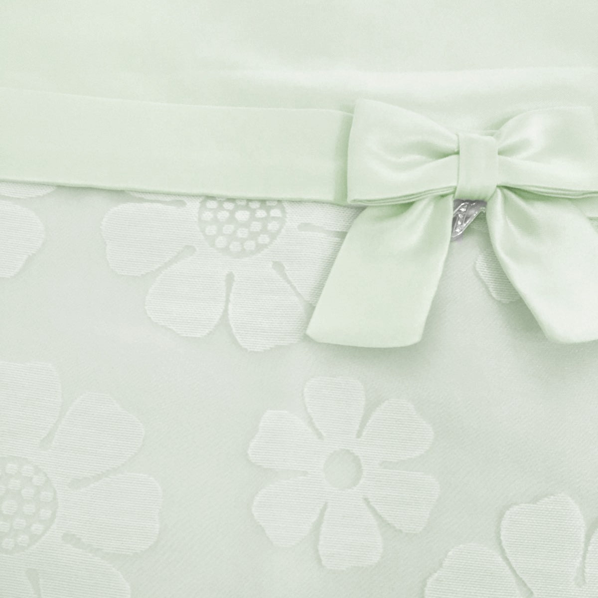 Sacco in raso verde in tinta unita con strato di organza ricamata di fiori bianchi e fascia con fiocchetto applicato al centro