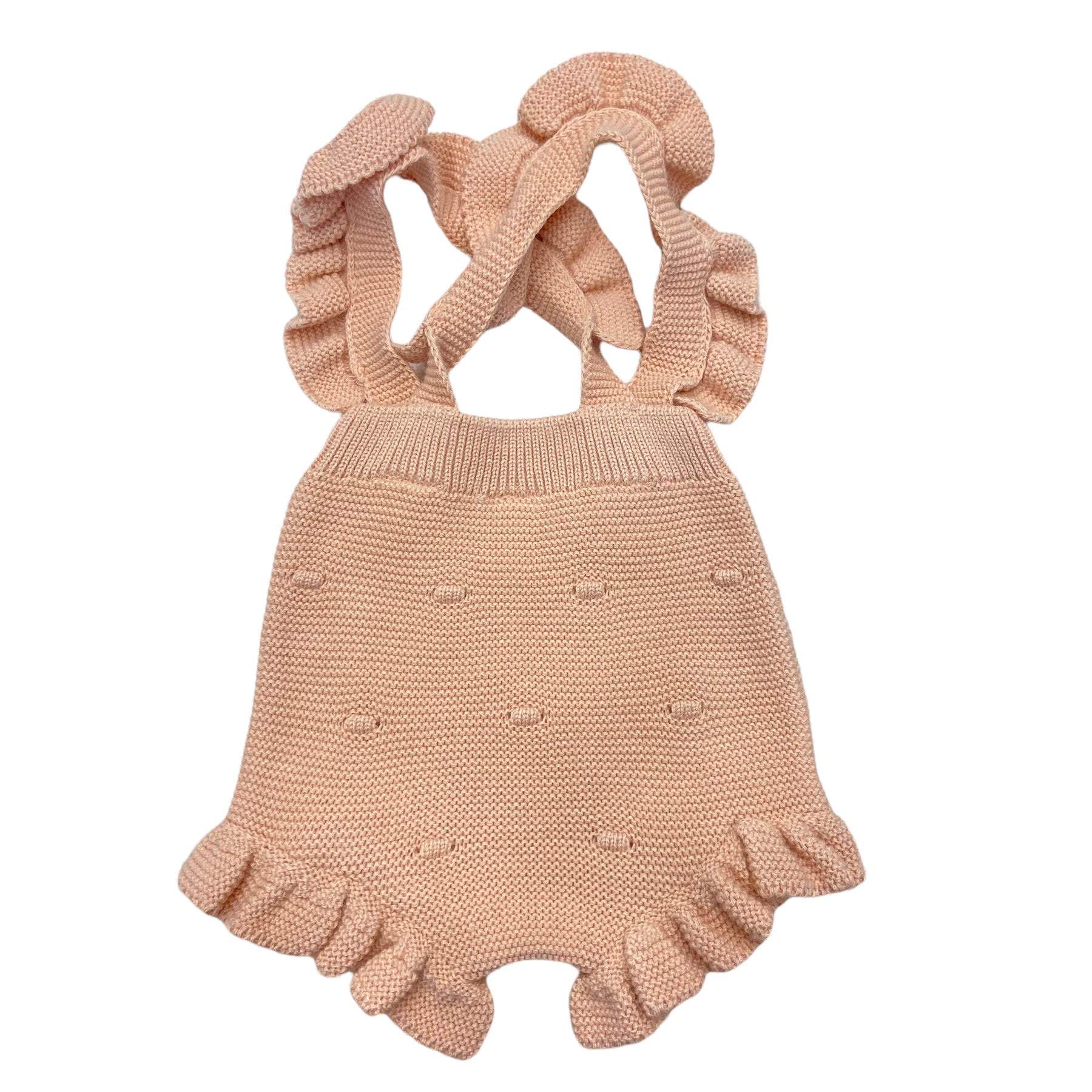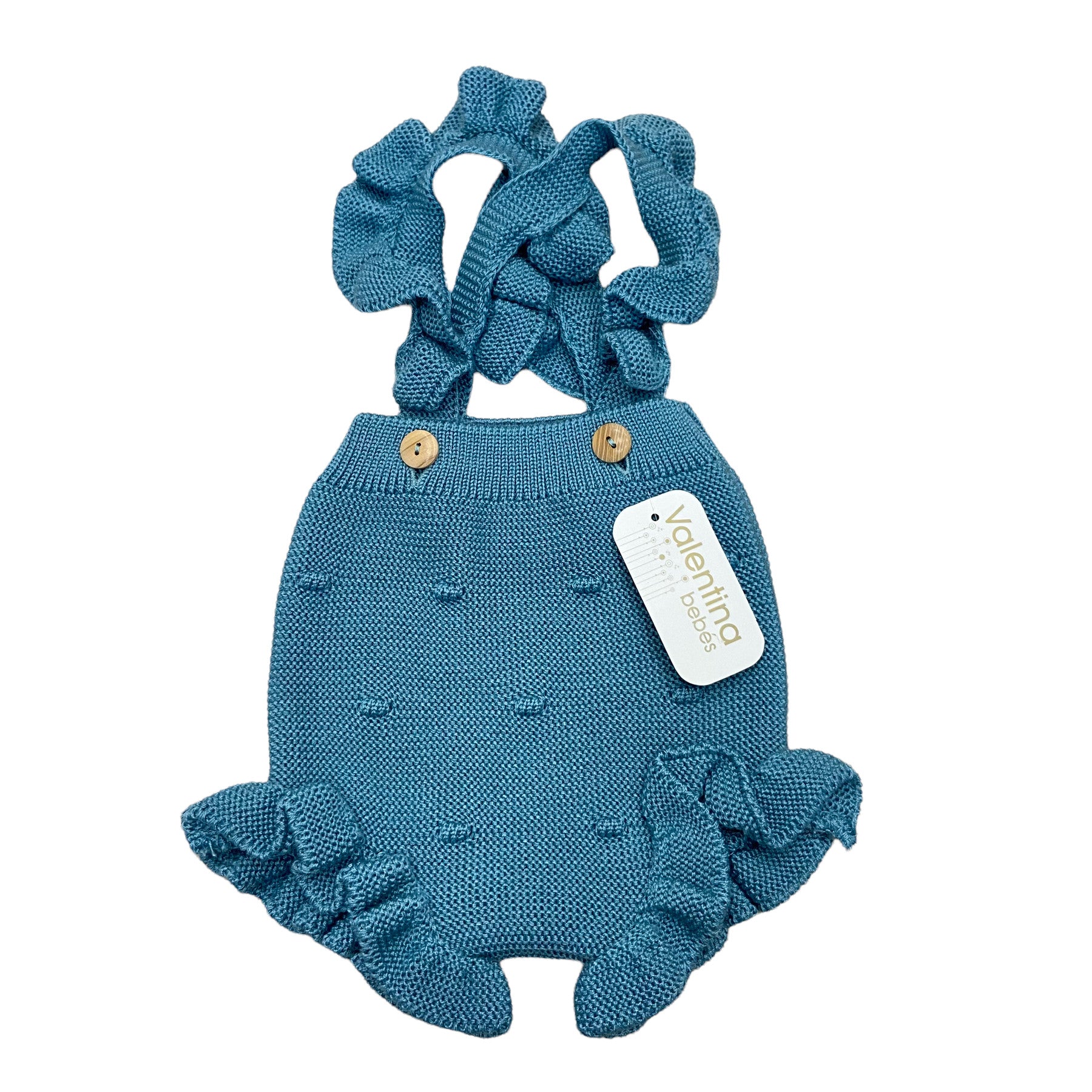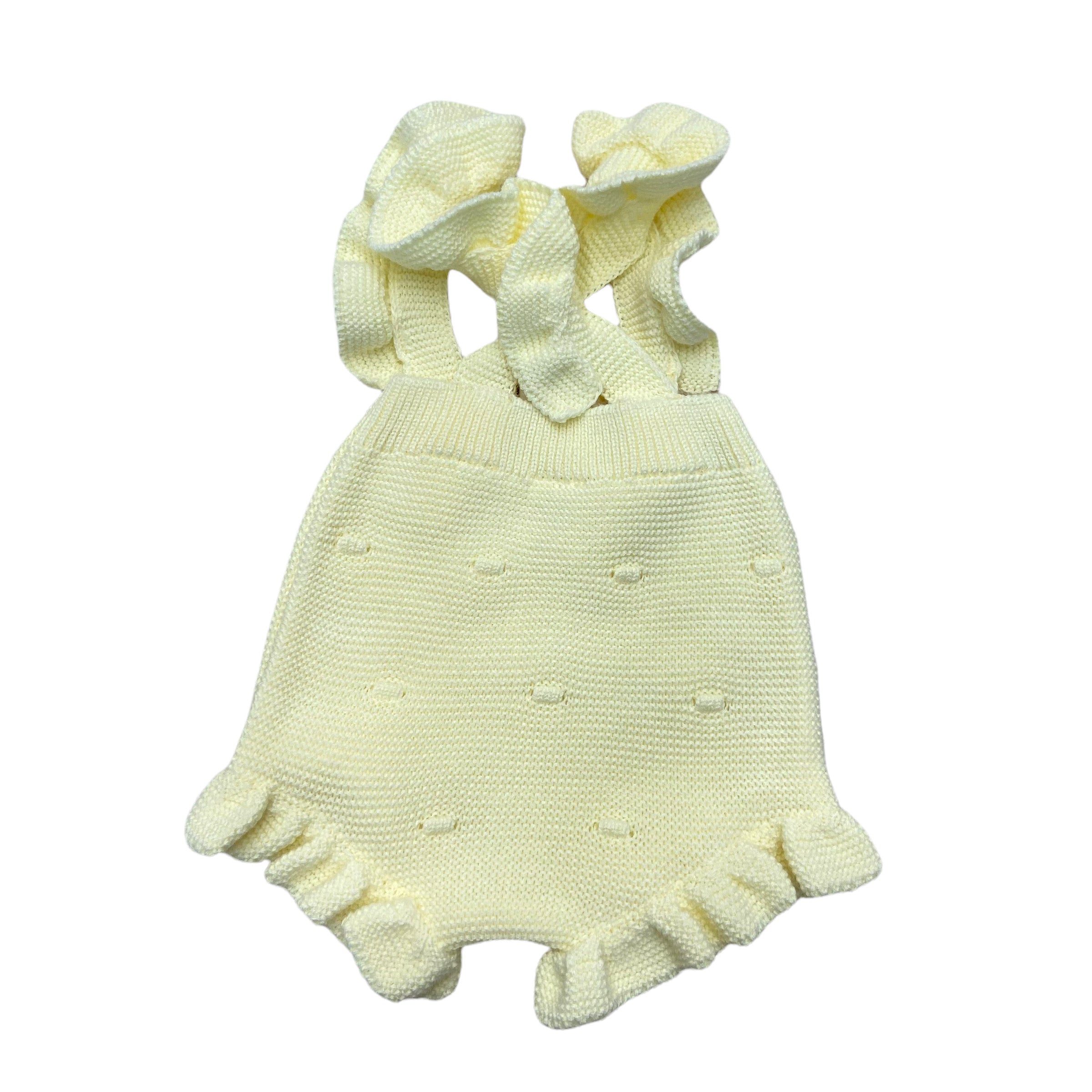 Bretelle con delle bellissime ruches con abbottonatura con un bottone in legno sul davanti. Culotte con delle lavorazioni in rilievo e sulle gambine è presente di nuovo le ruches