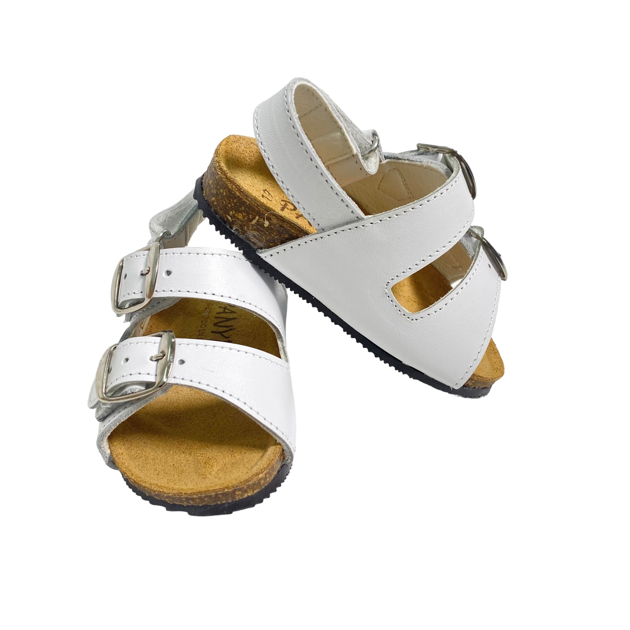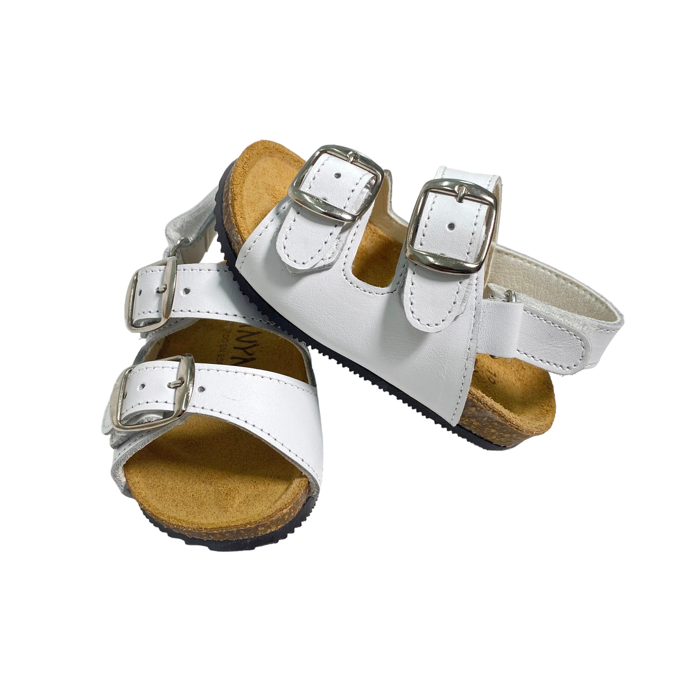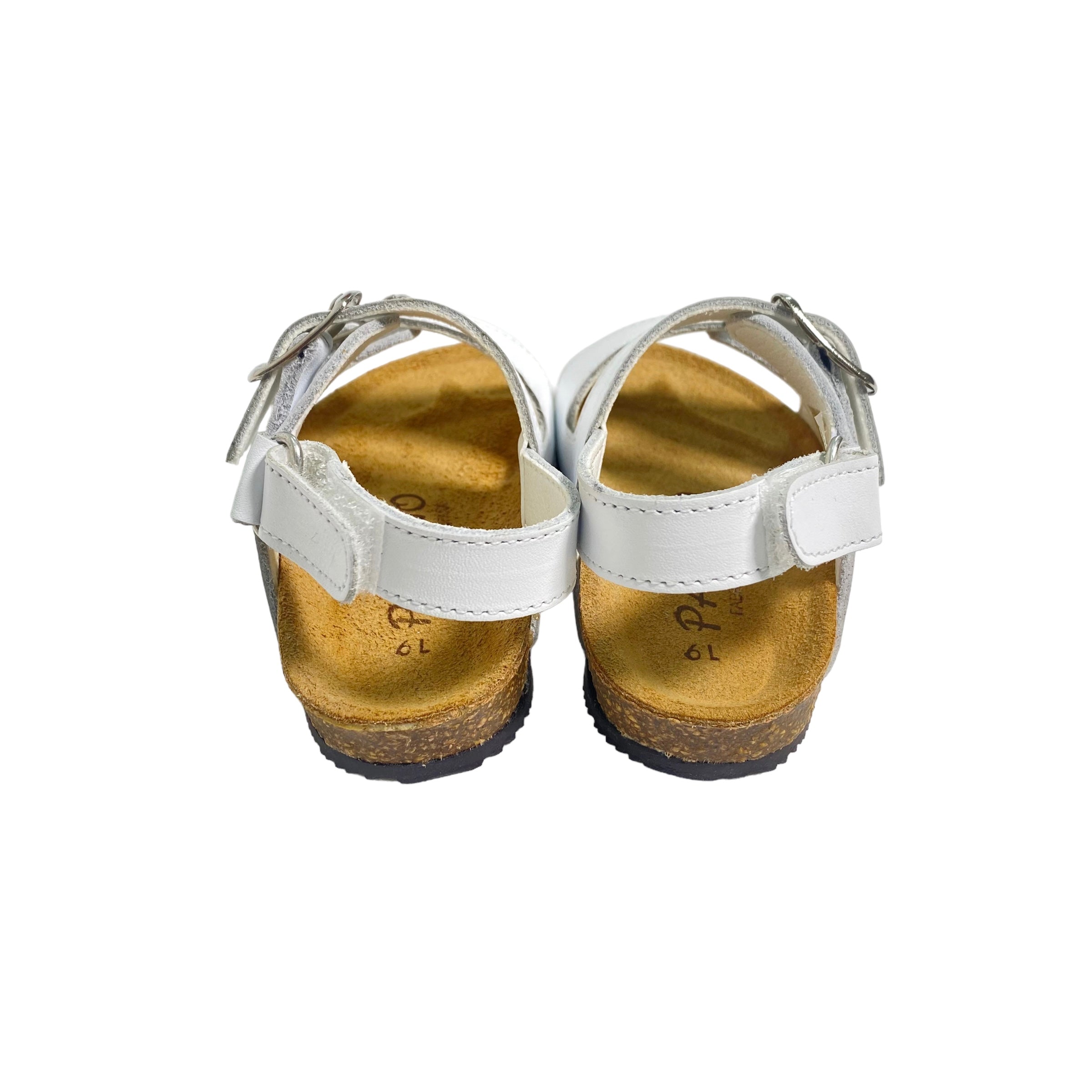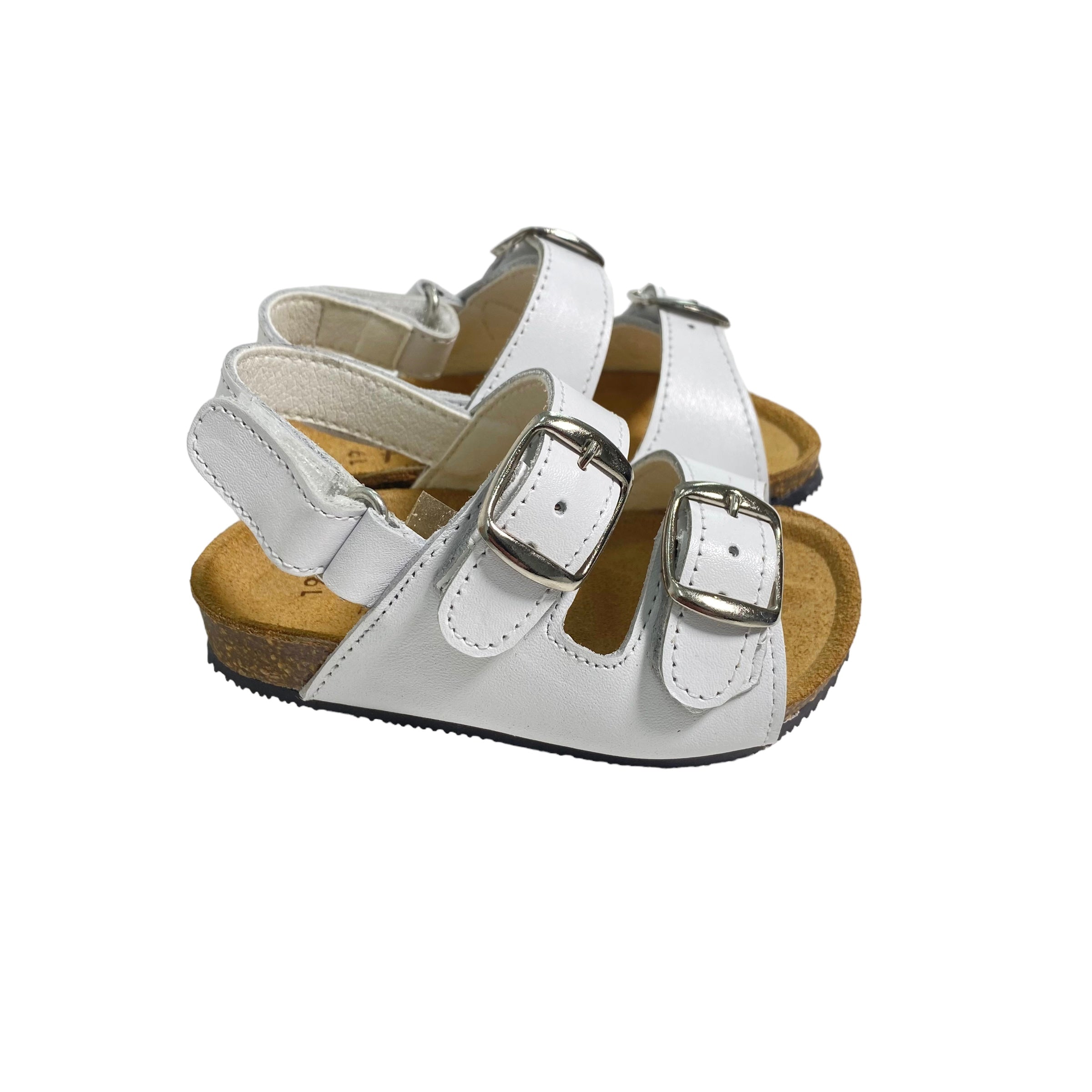 Sandali primi passi in pelle, con fibie regolabili e suola in gomma.