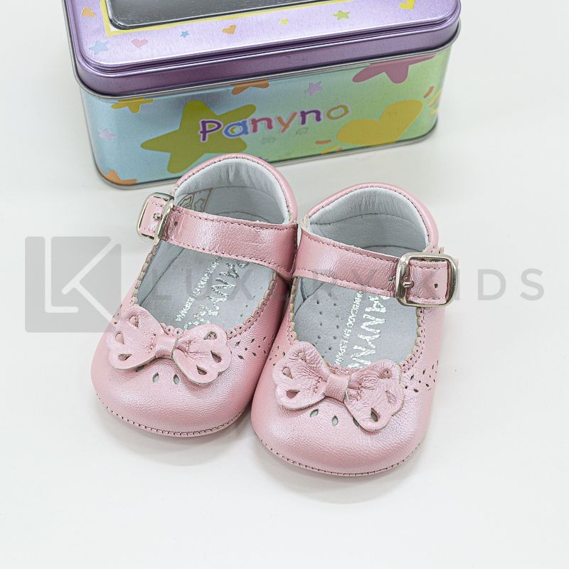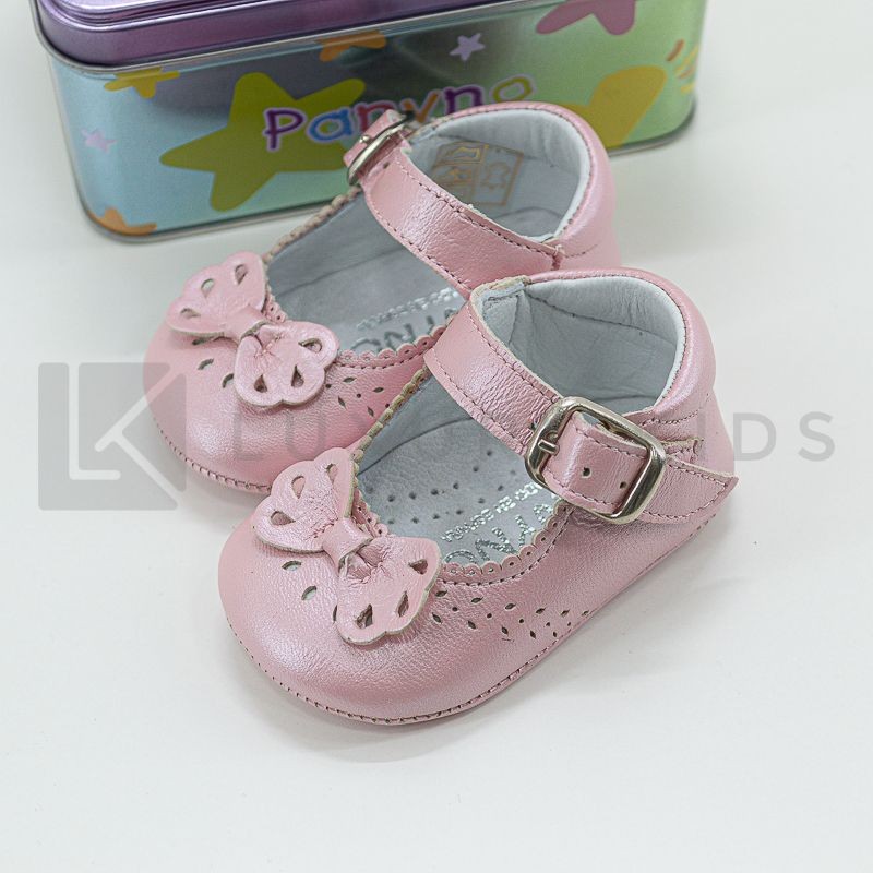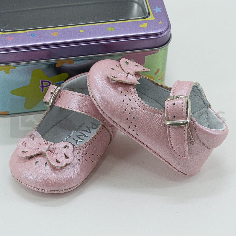 Scarpa da culla in pelle satinata con fiocchetto sul davanti e chiusura con fibbia.