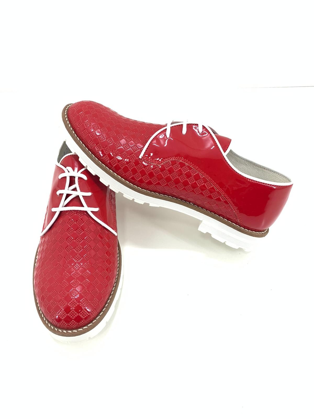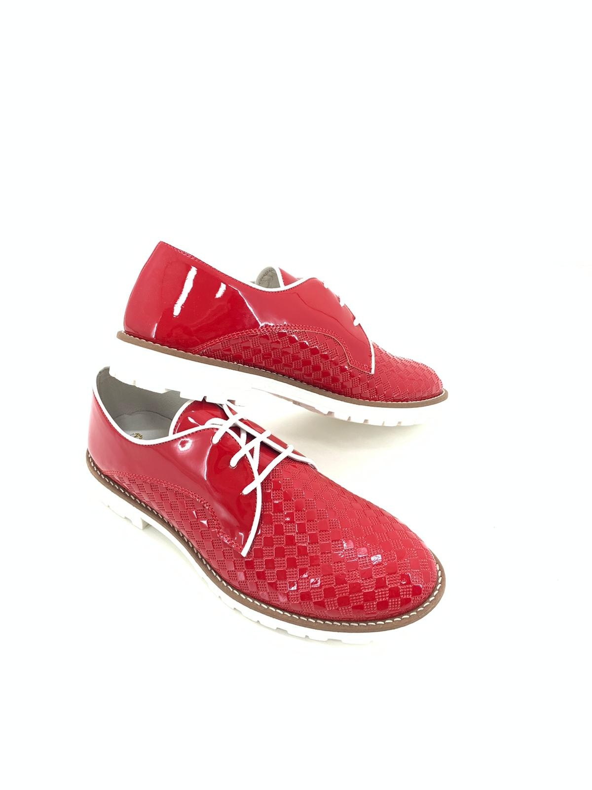 Francesina lucida rossa, con suola in gomma bianca e lacci bianchi.