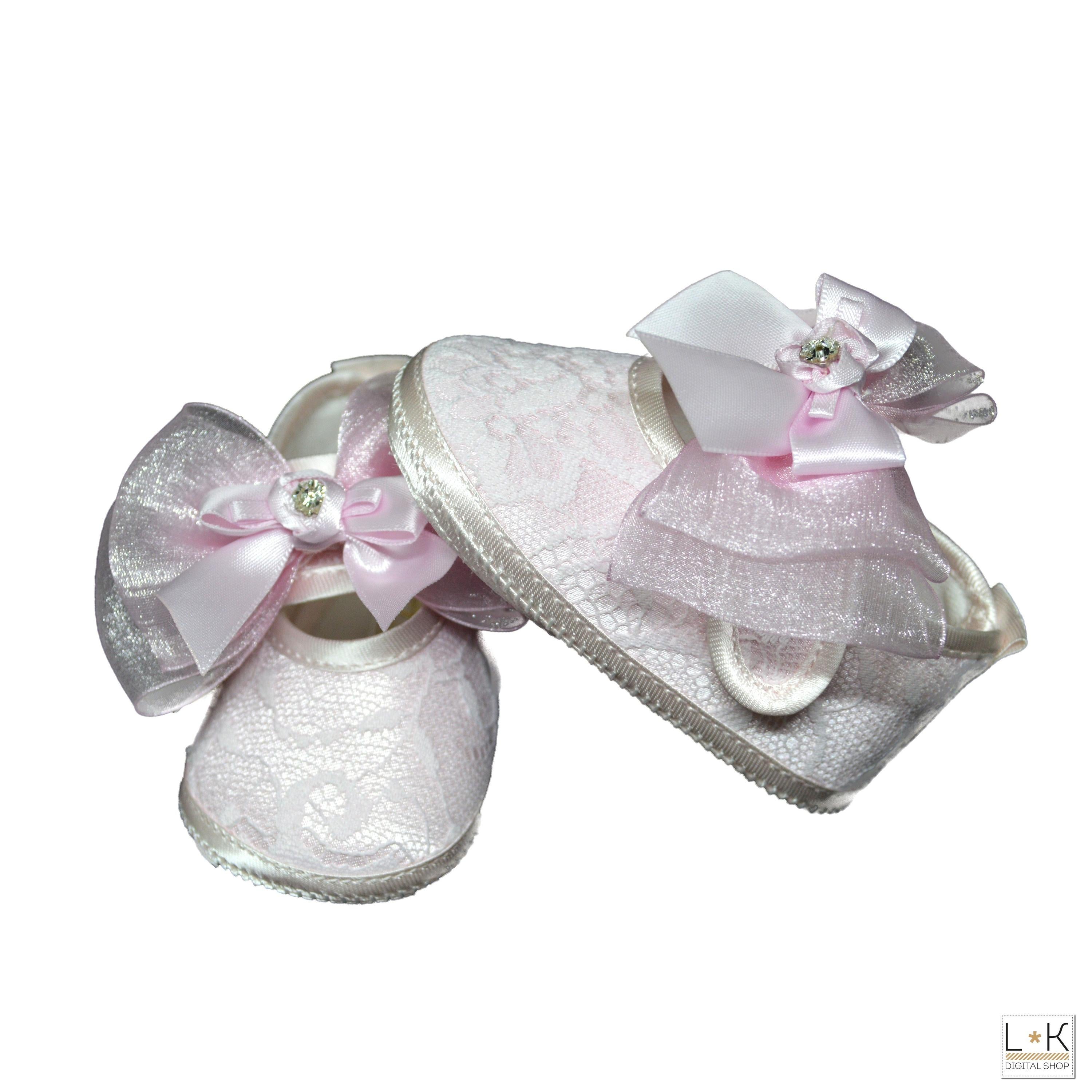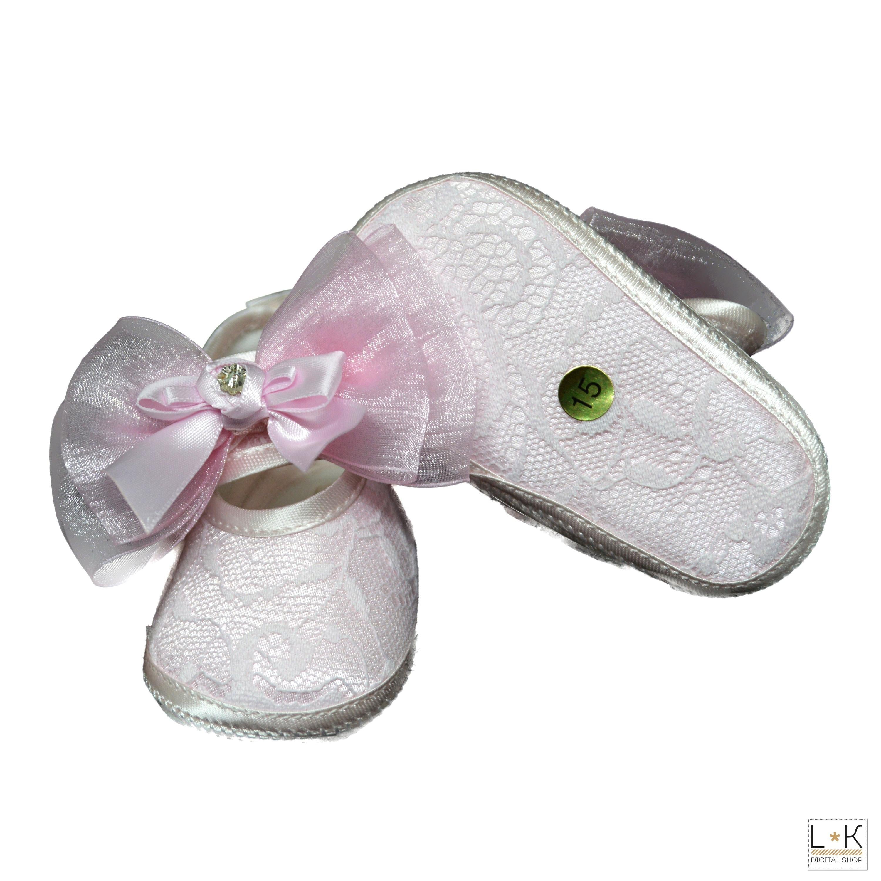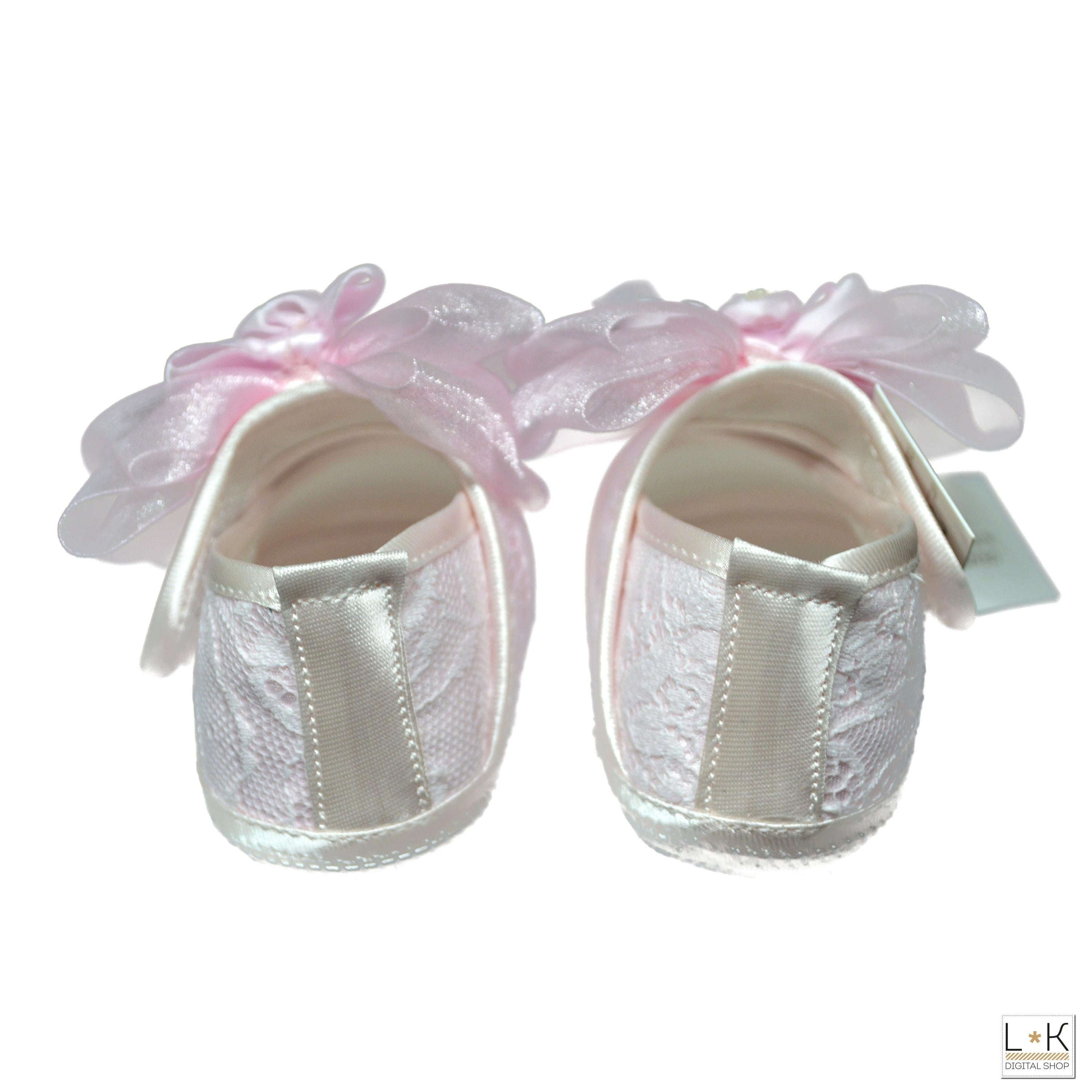 Ballerina in tessuto ricoprta di pizzo, con cinturino con sopra applicazione di fioccone in organza
