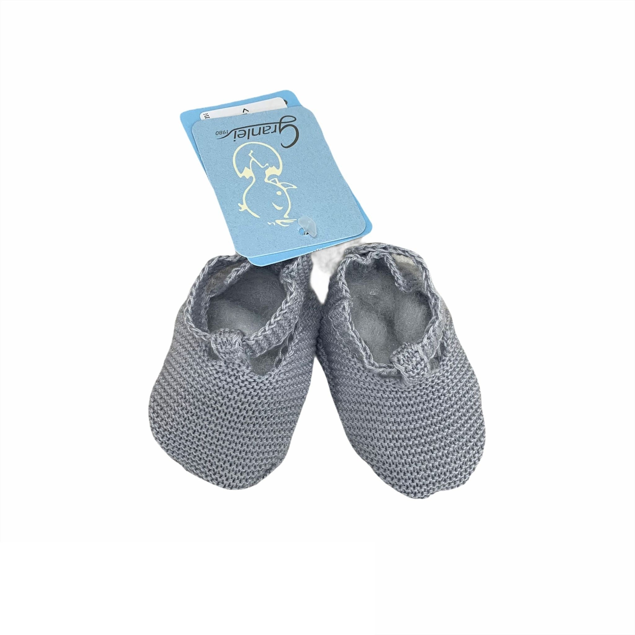 Scarpe da culla in filo di cotone, chiusura con bottoncini in madreperla.