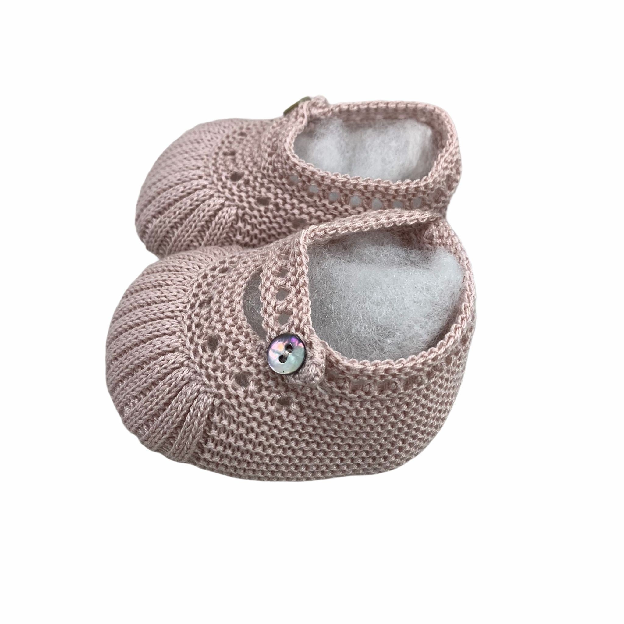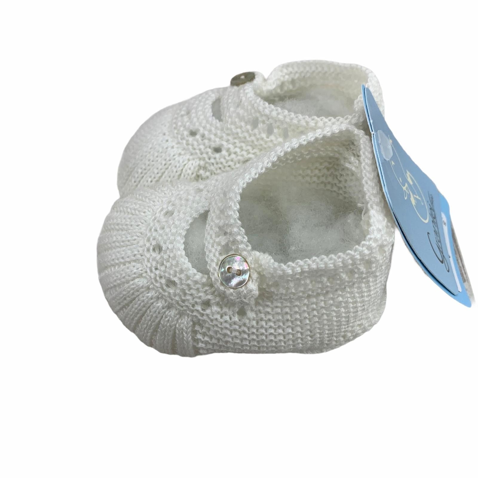 Scarpe da culla in filo di cotone traforata sui bordi, chiusura con bottoncini in madreperla.