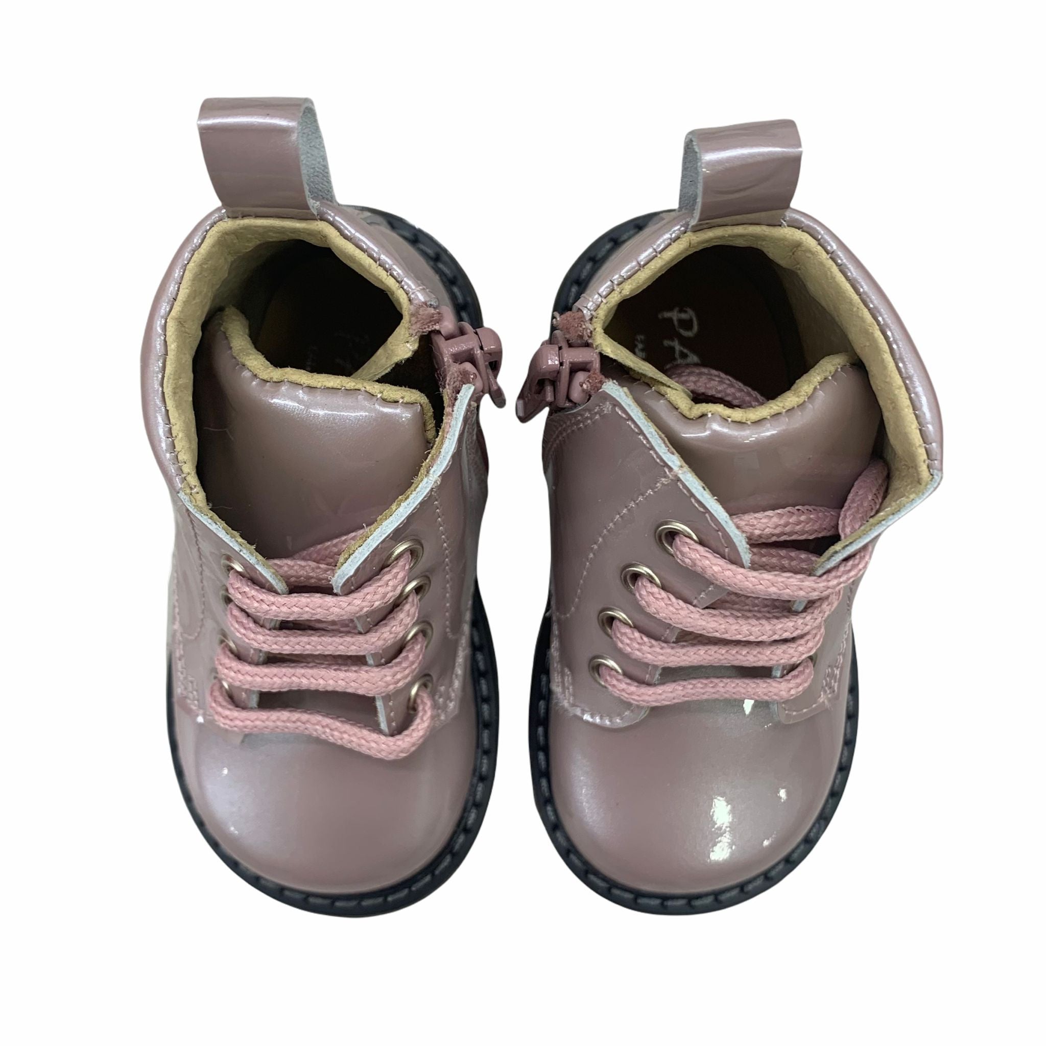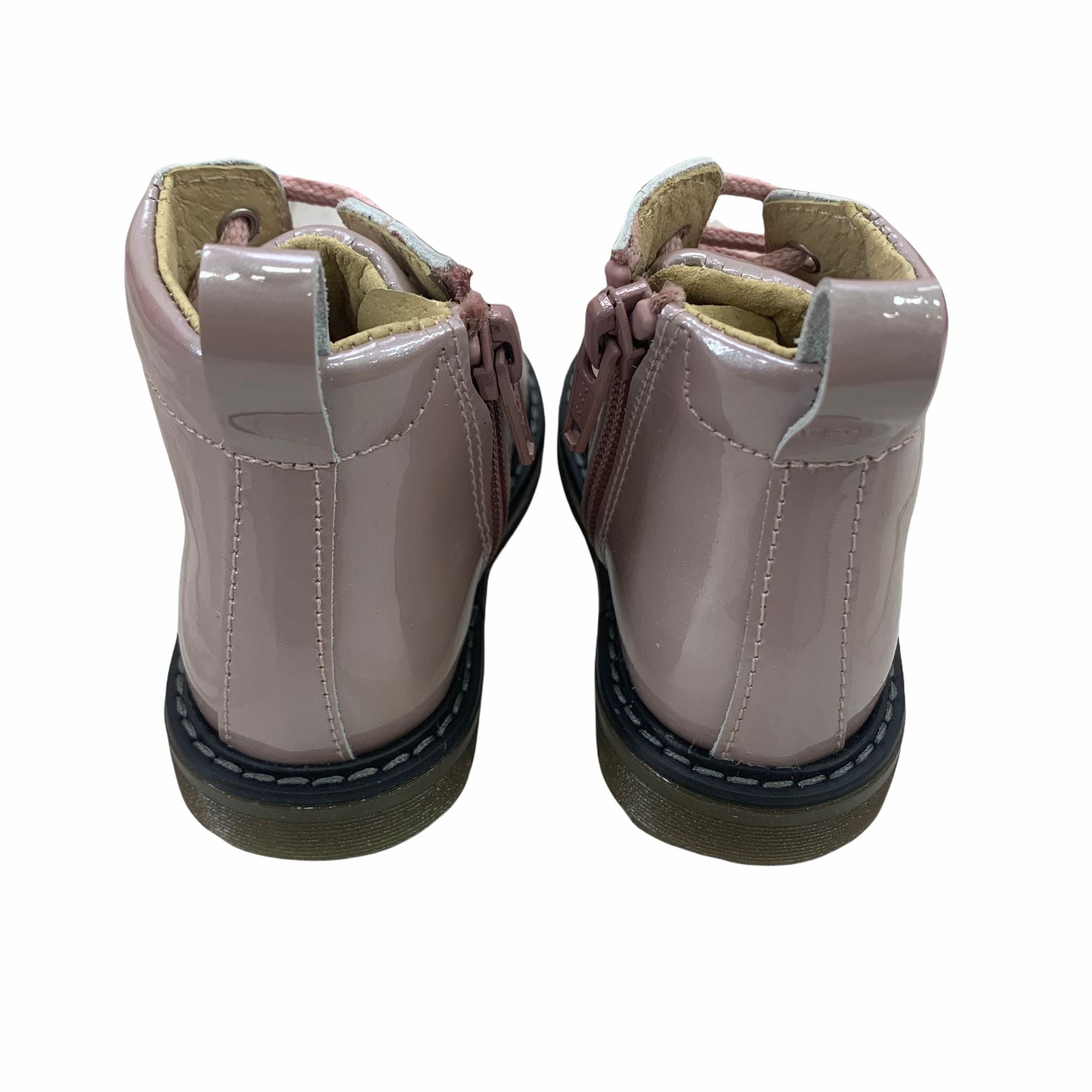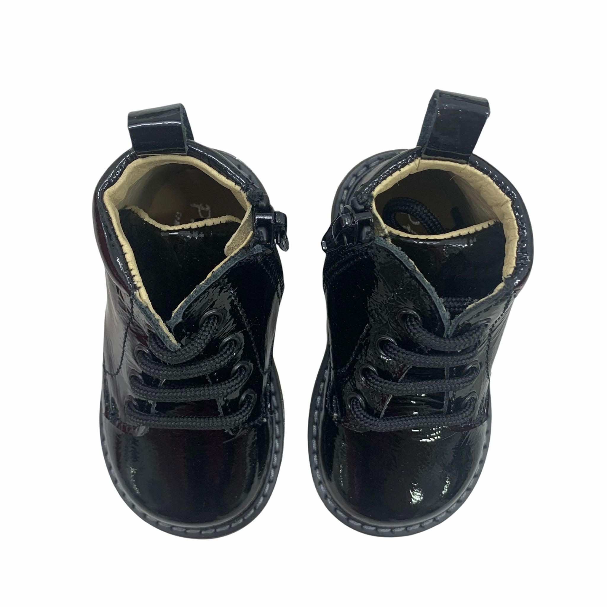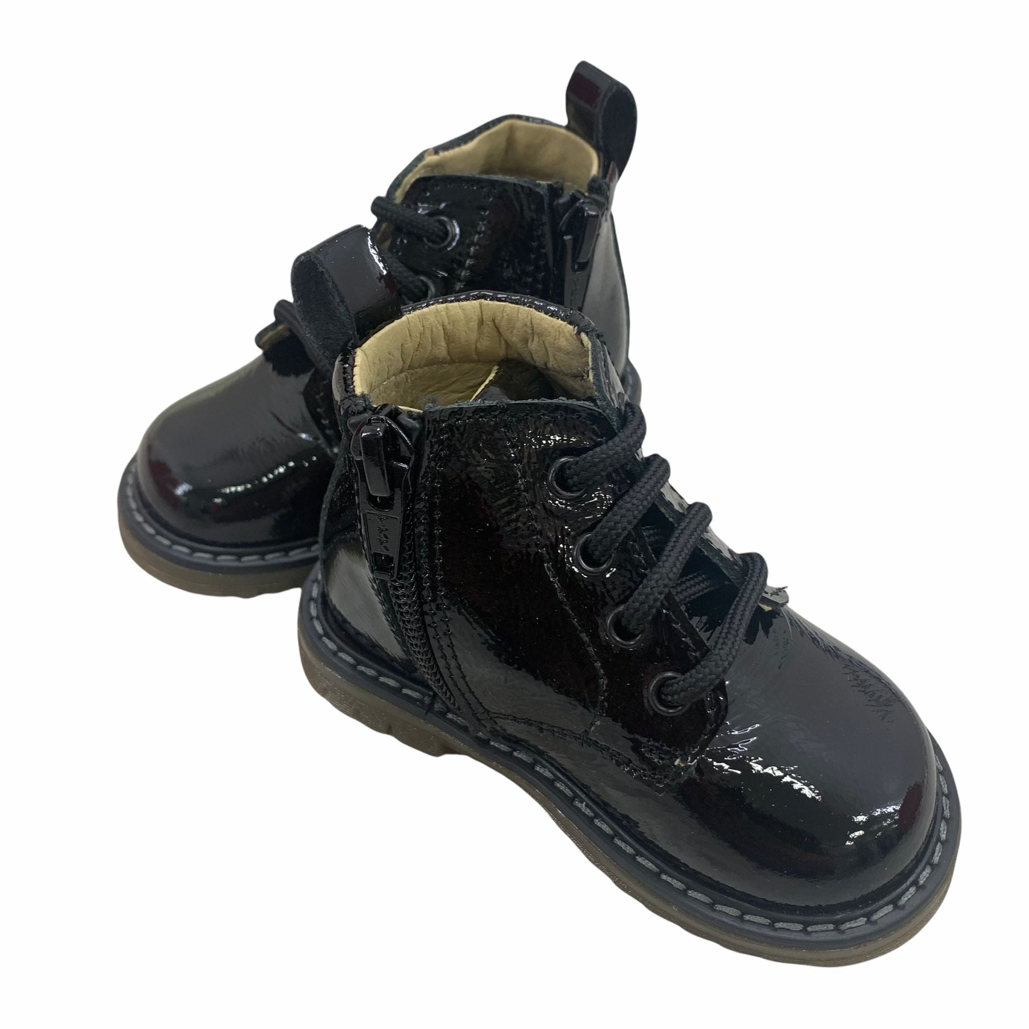 Scarponcini in vernice nera con suola antiscivolo, lacci e cerniera al lato.