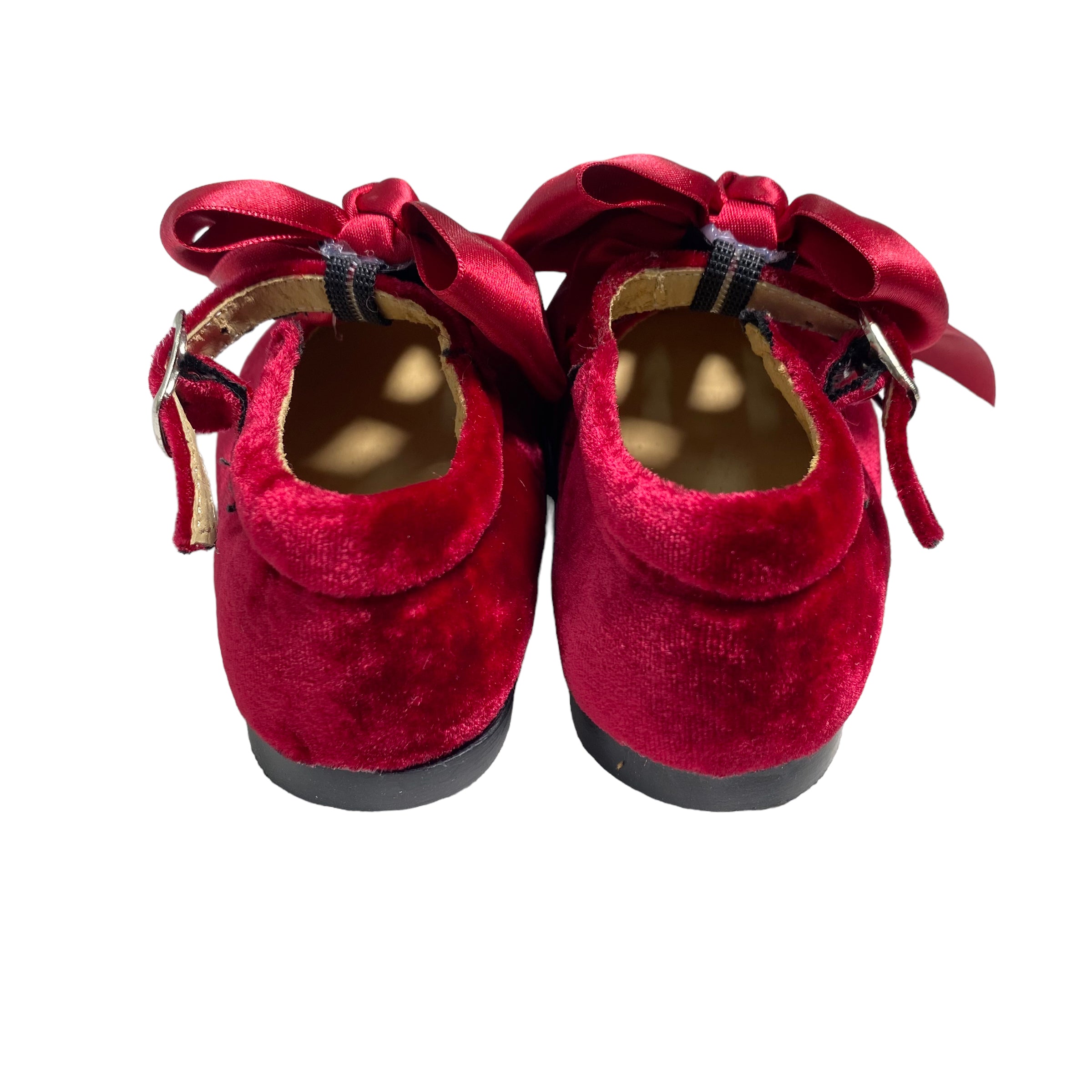 Scarpe primi passi in velluto, con occhielli e fiocco removibile, e chiusura con cinturino.