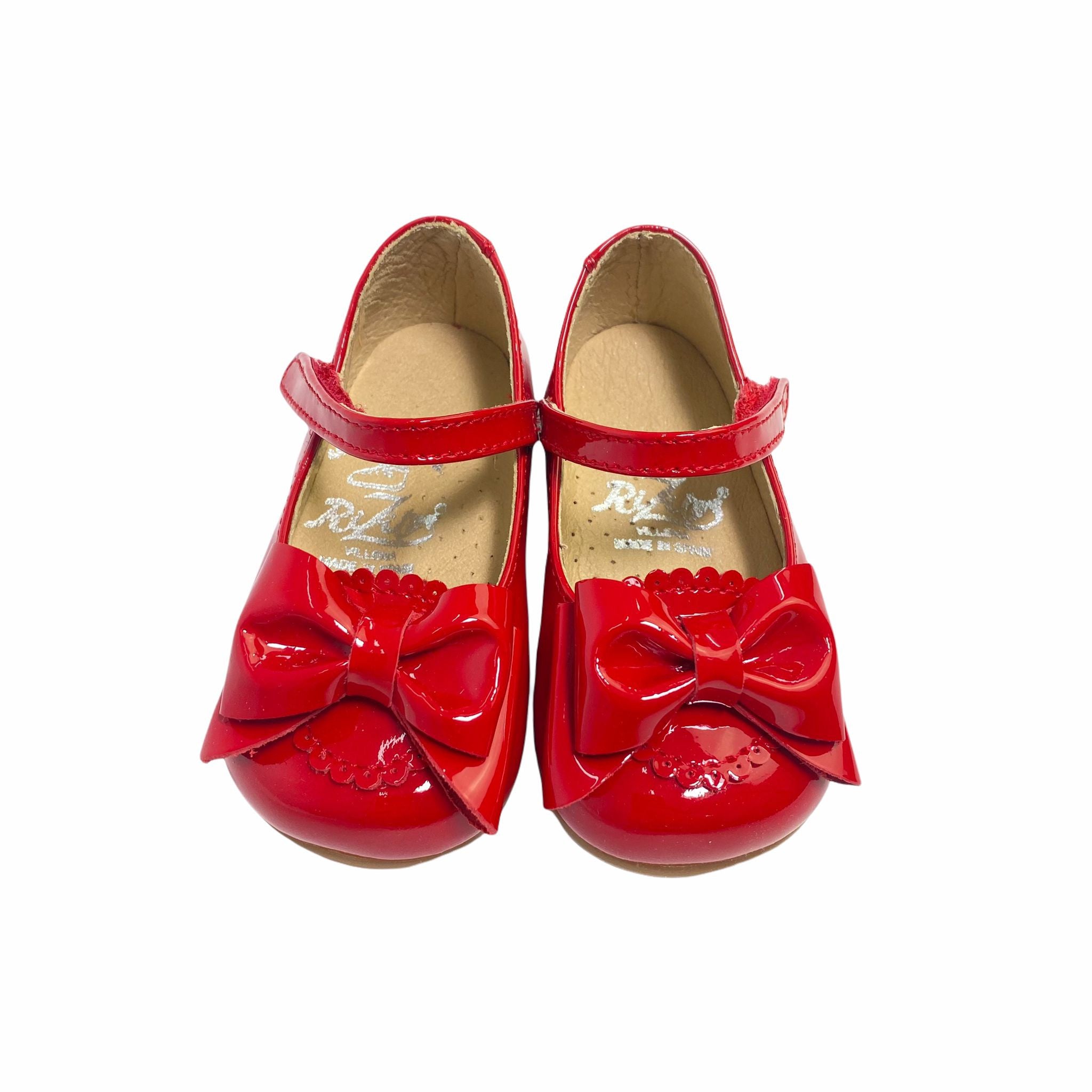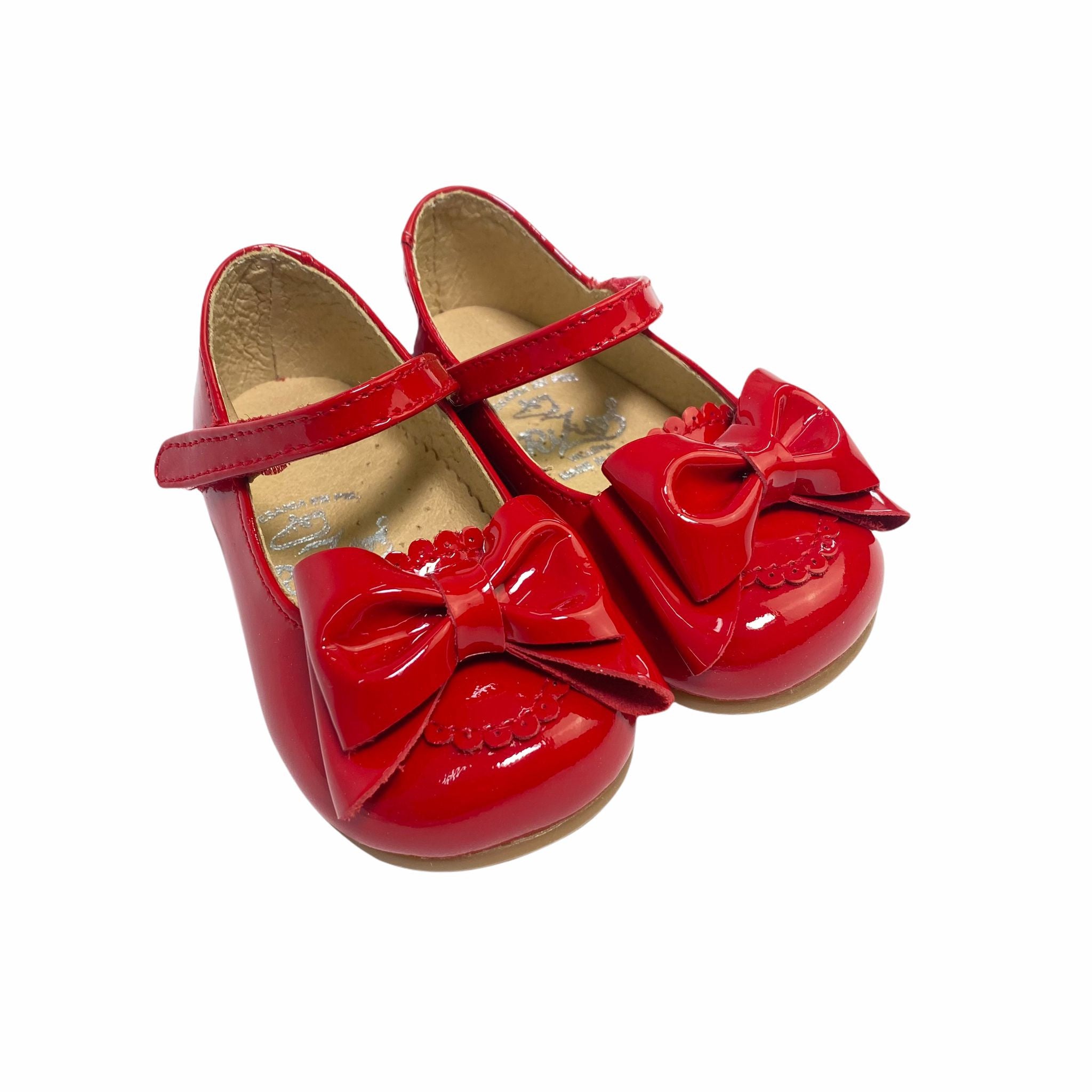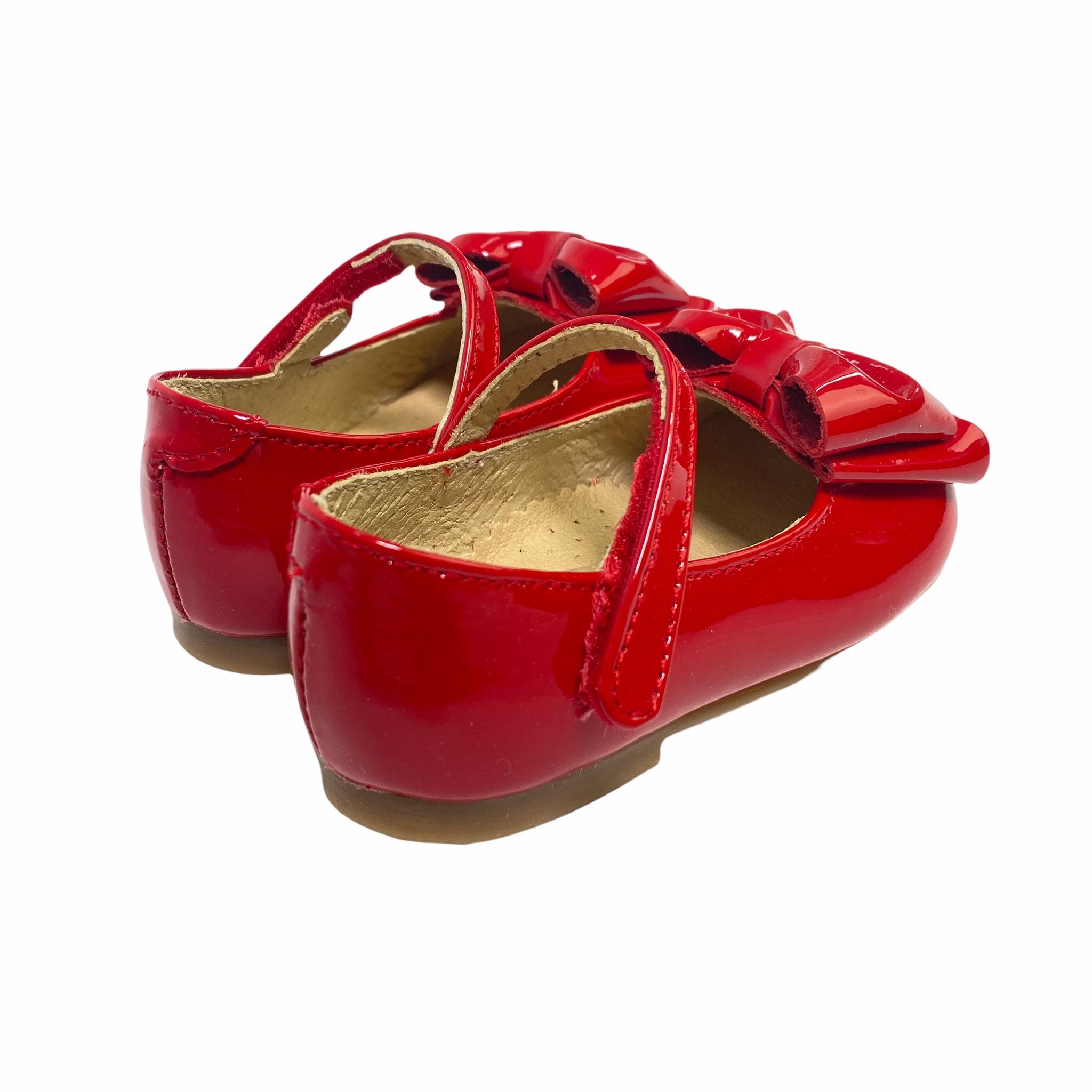 Ballerine in vernice rossa con suola antiscivolo, strappo alla caviglia e fiocco sulla punta.