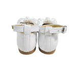 Scarpe primi passi modello ballerina, con chiusura con cinturino, e applicazione di doppio fiocco in raso sul davanti.