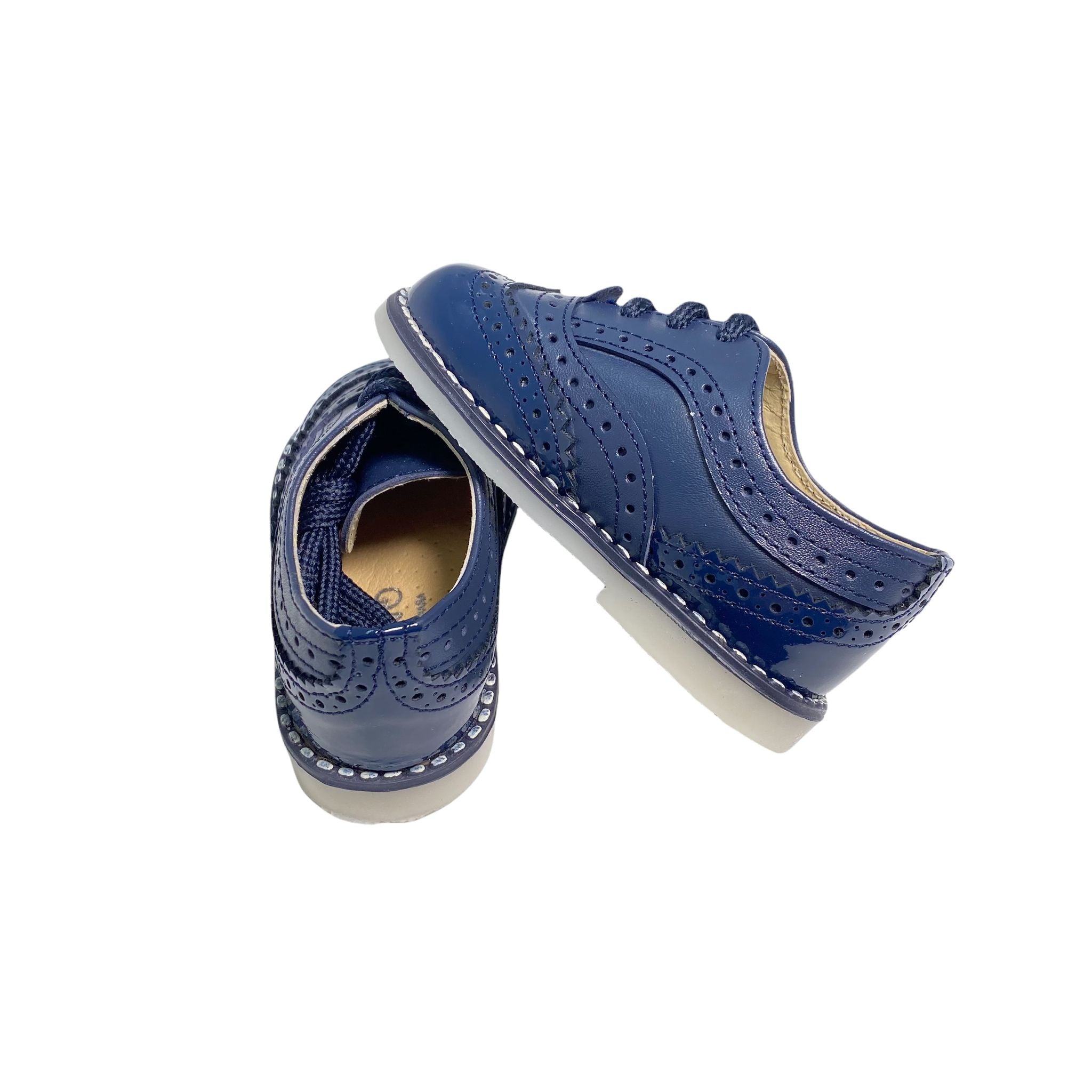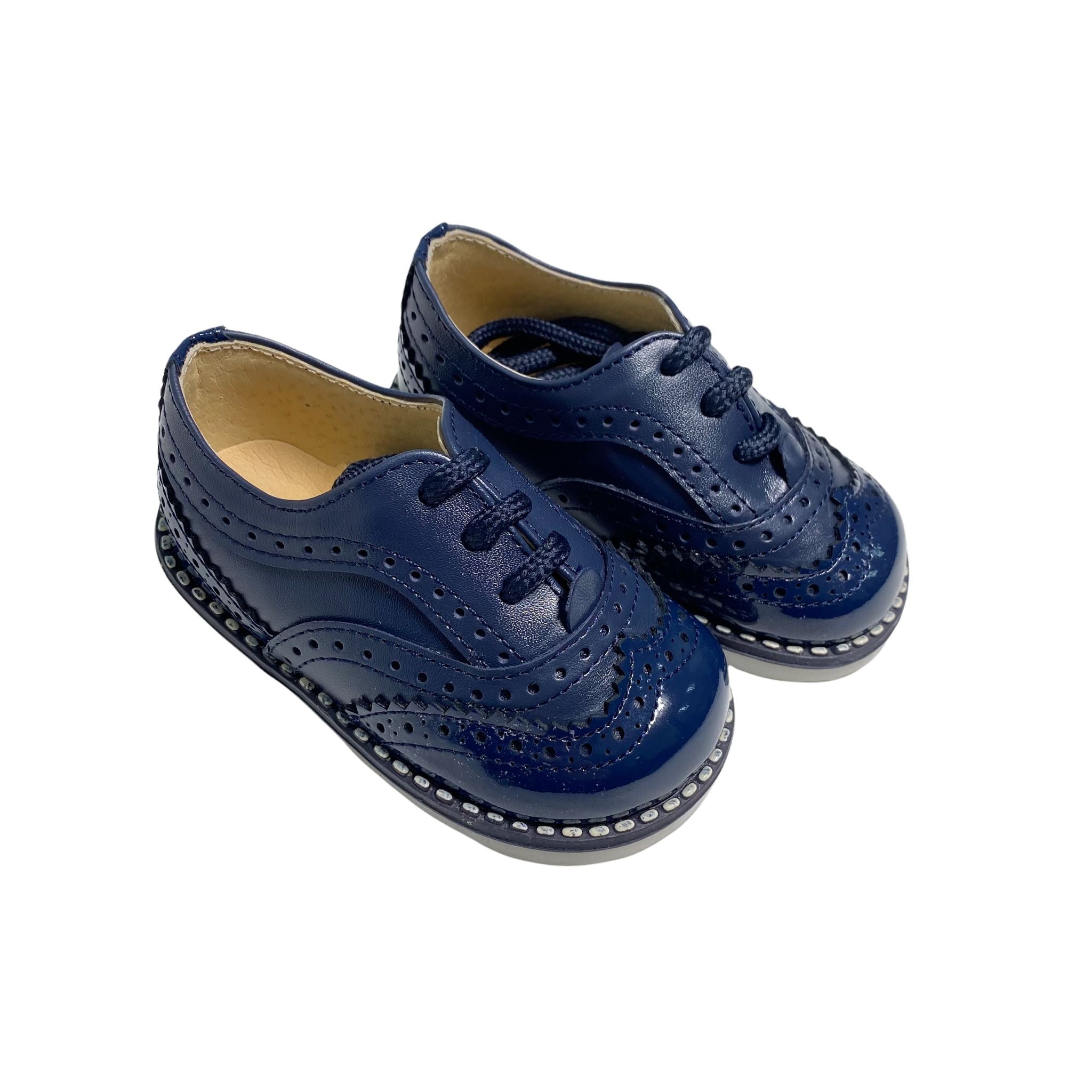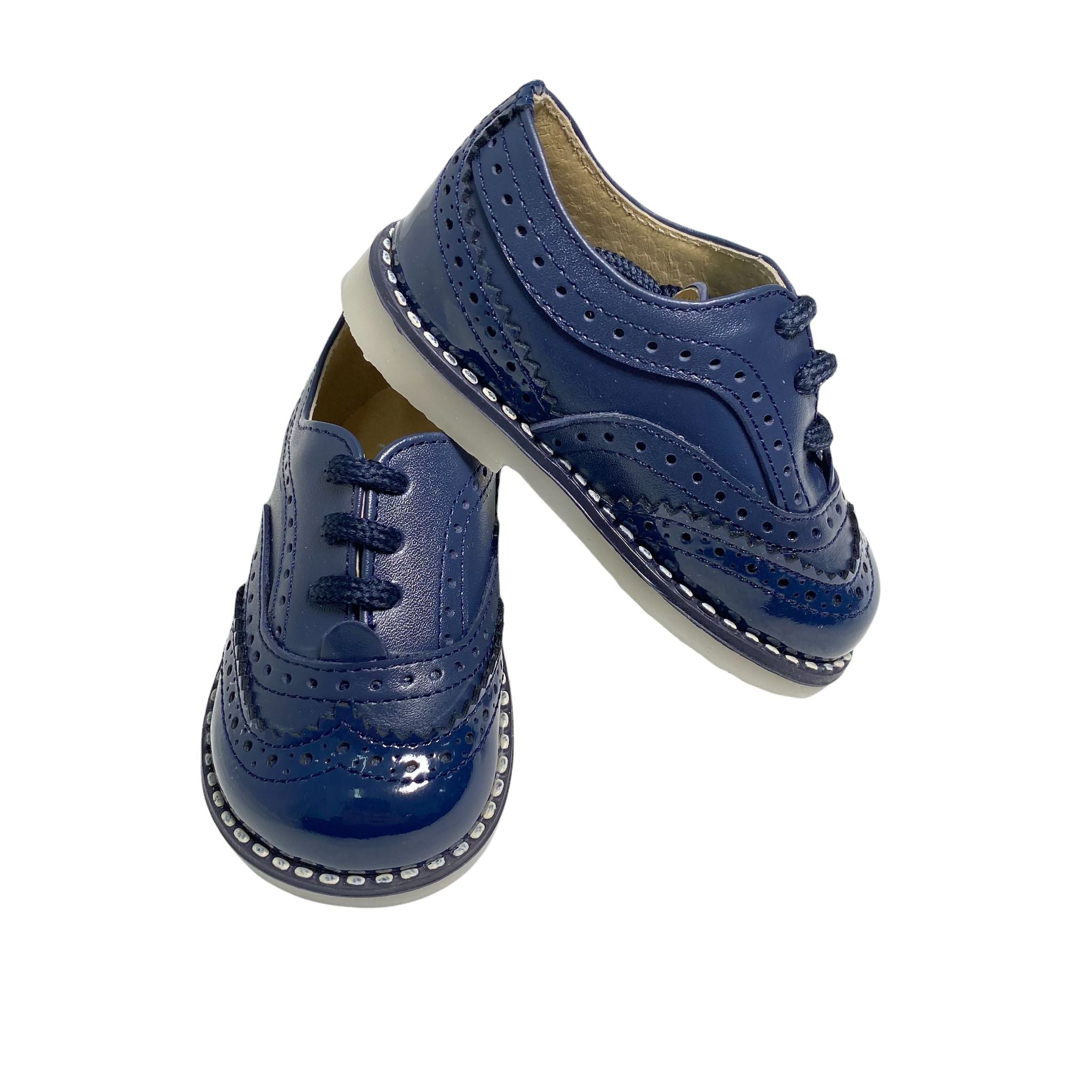 Scarpe primi passi in vera pelle, modello francesina con lacci, in tinta unita blu con punta in vernice.