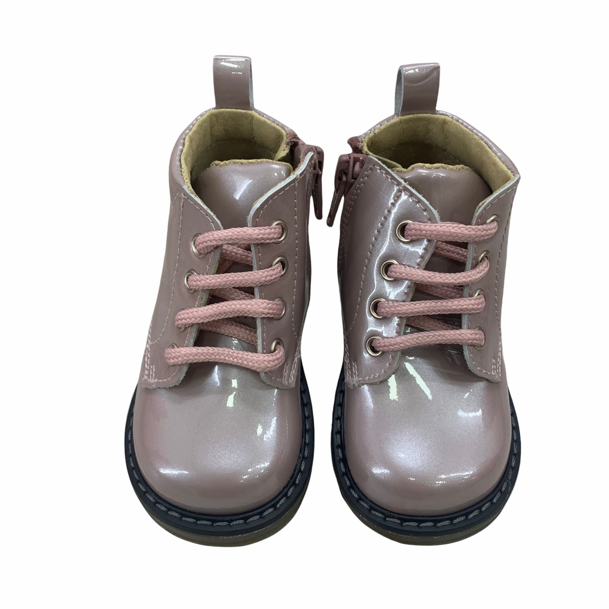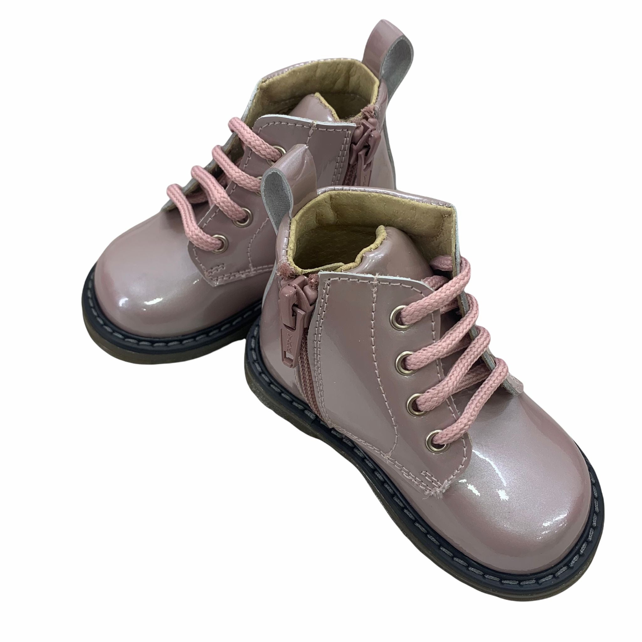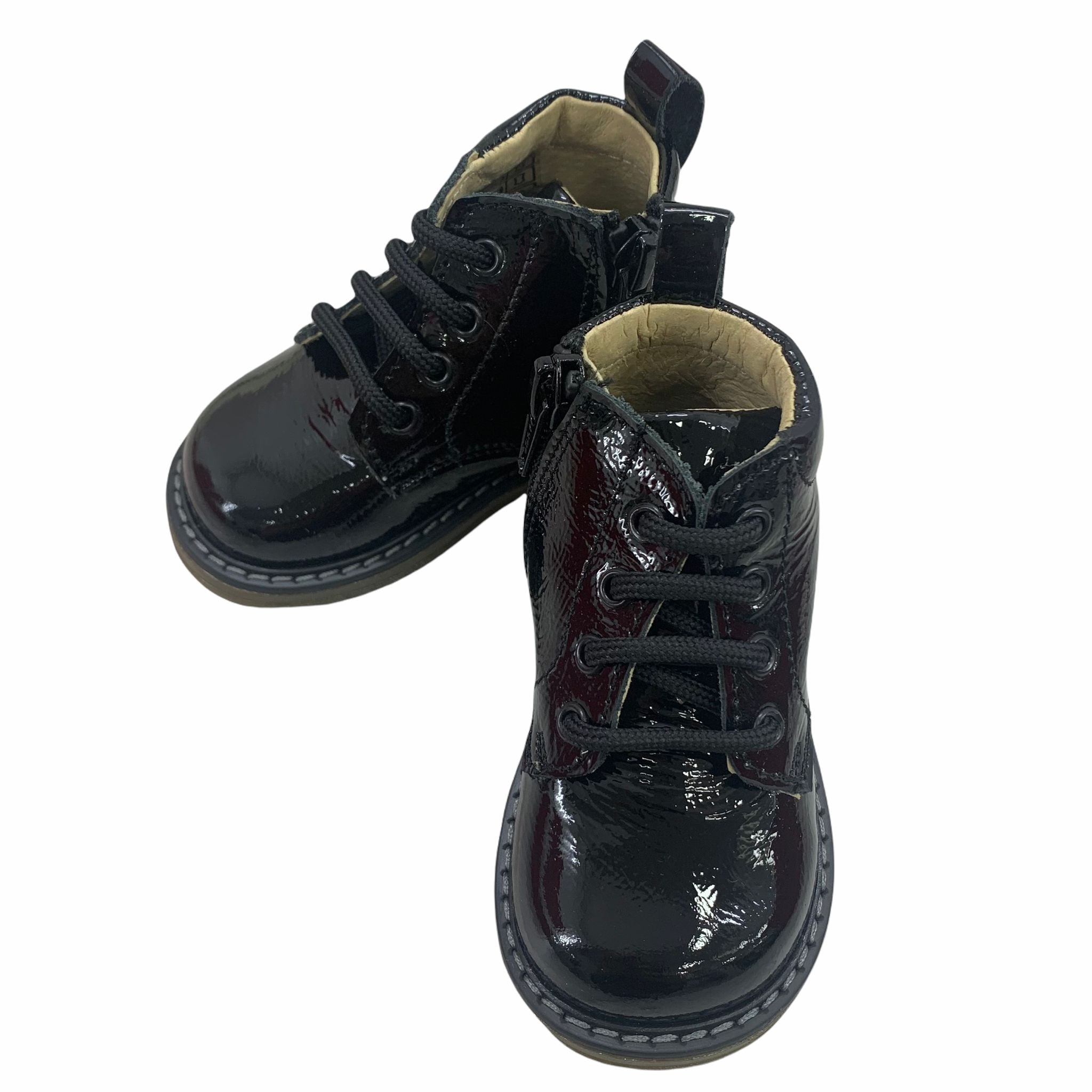 Scarponcini in vernice nera con cerniera al lato, lacci e suola antiscivolo.