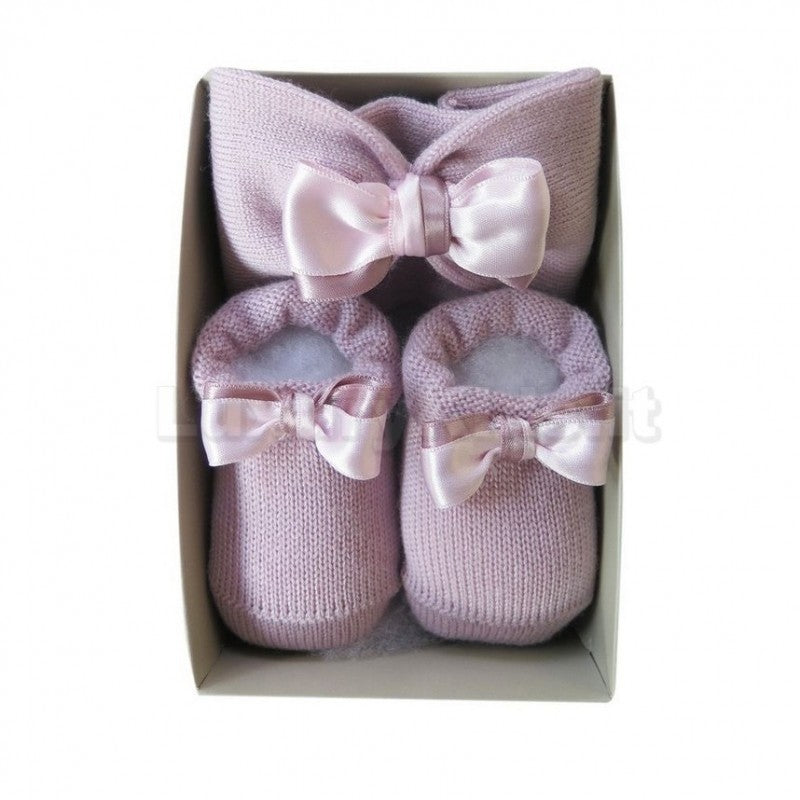 Set calzini scapertta e fascia in lana con fiocco bicolore in raso