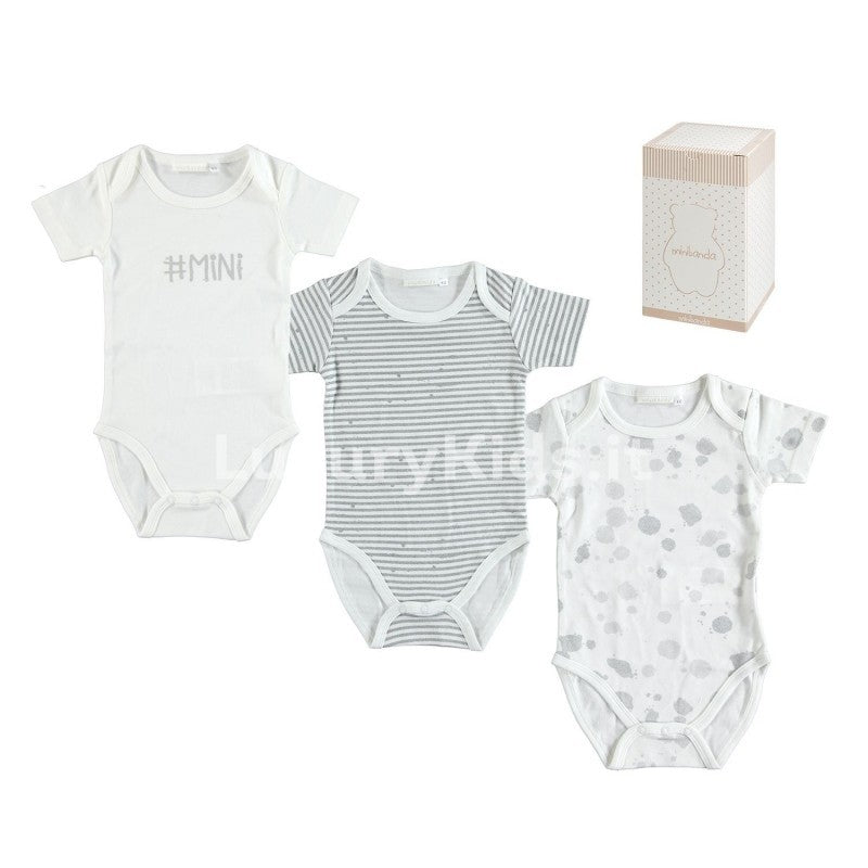 Set tre body in cotone mezza manica in simpatiche fantasie e chiusura con ciappette.