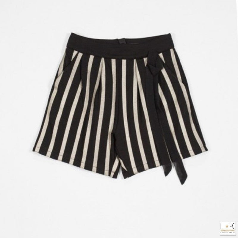 Short elegantein misto caldo cotone nero a righe dorate con fiocchettto applicato sul punto vita e tasche america