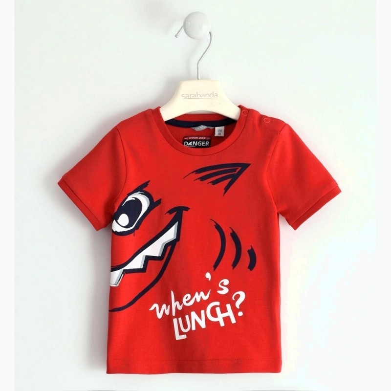 Simpaticissima t-shirt Sarabanda realizzata in jersey di cotone al 100%. La grafica è dedicata a uno squalo affamato! Apertura sulla spalla con bottoni snap fino alla taglia 3 anni