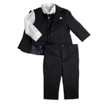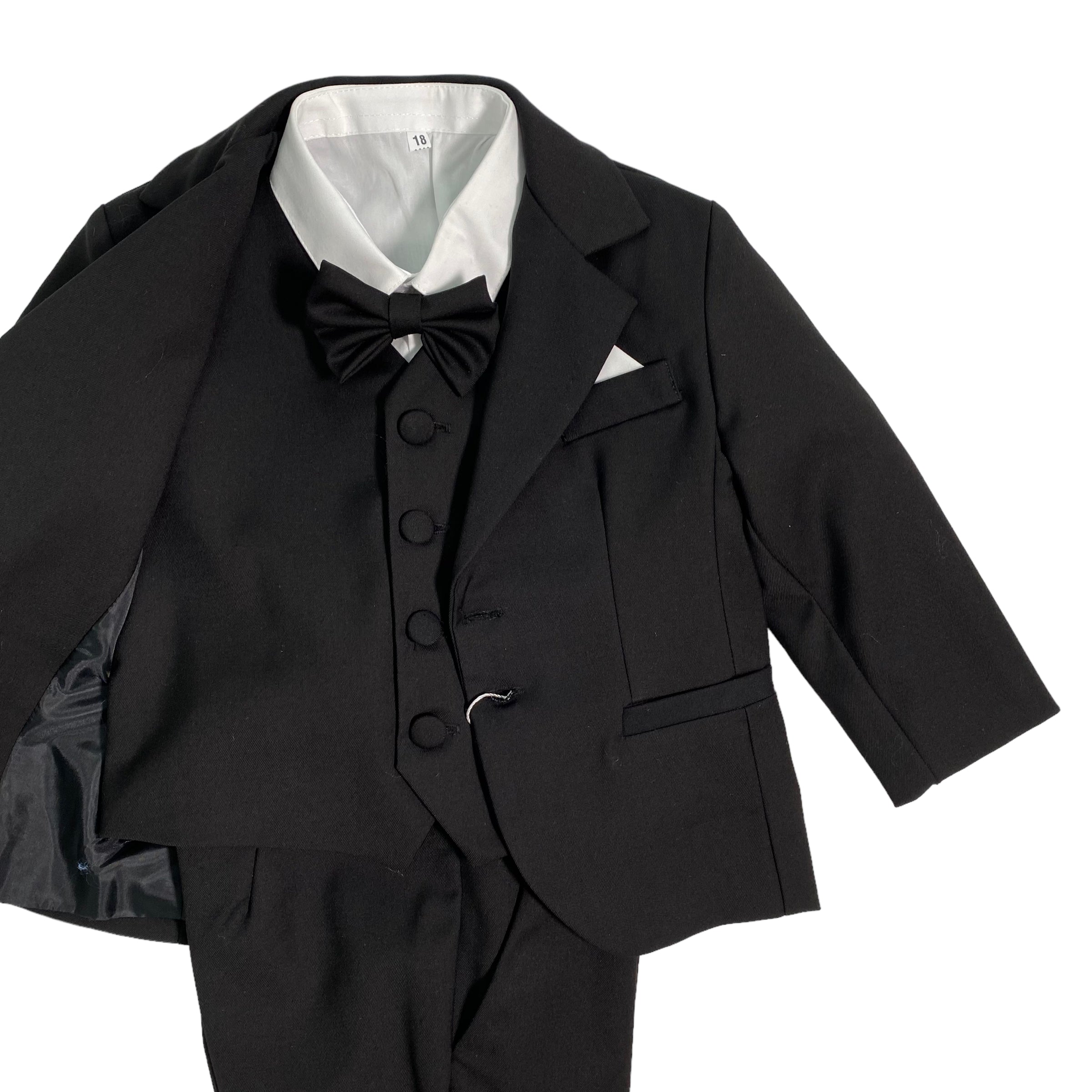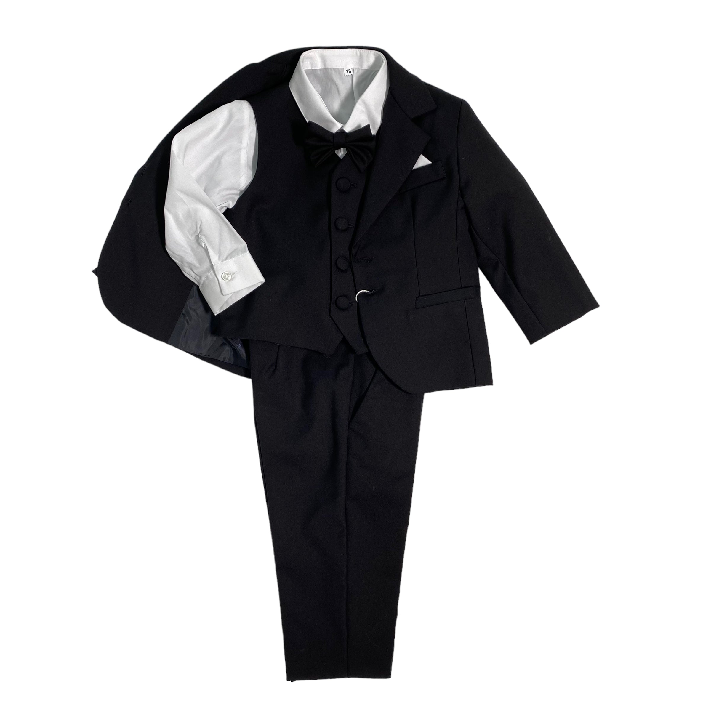 Smoking elegante 5 pezzi in caldo cotone composto da pantalone, camicia, panciotto, papillon e giacca.
