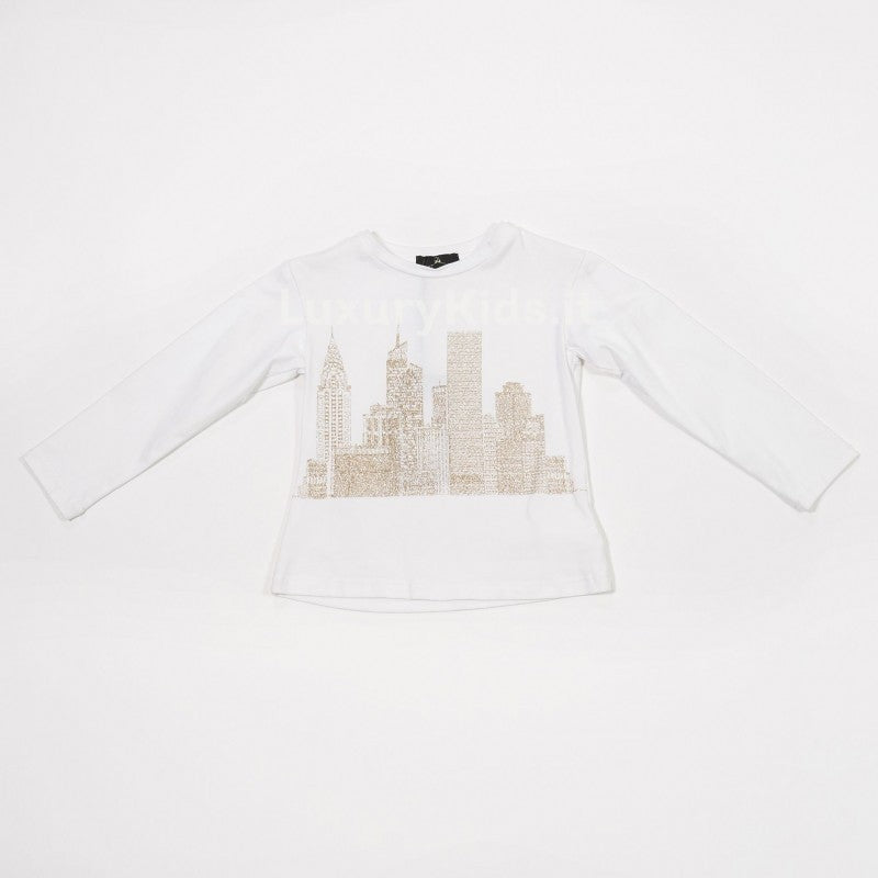 -T-Shirt in caldo cotone bianco a maniche lunghe con stampa glitterata di grattaciel sul davanti