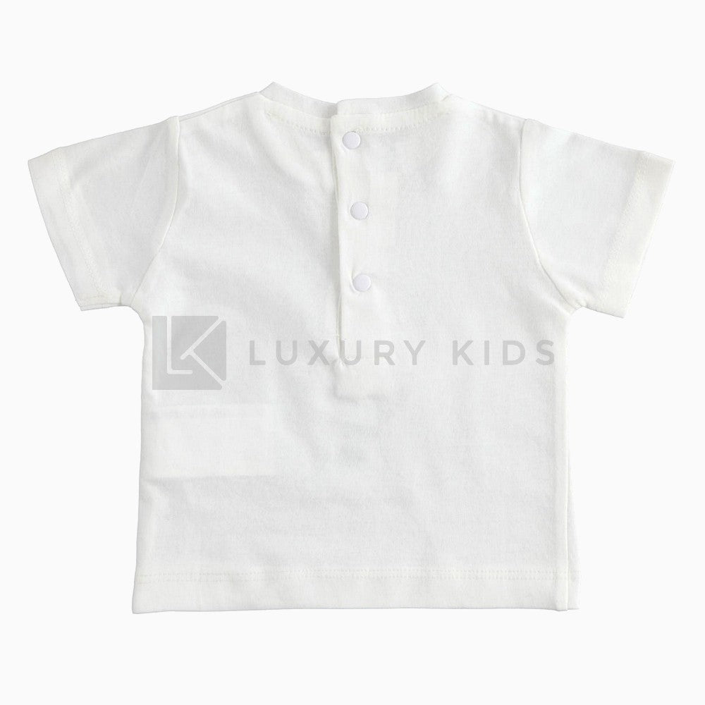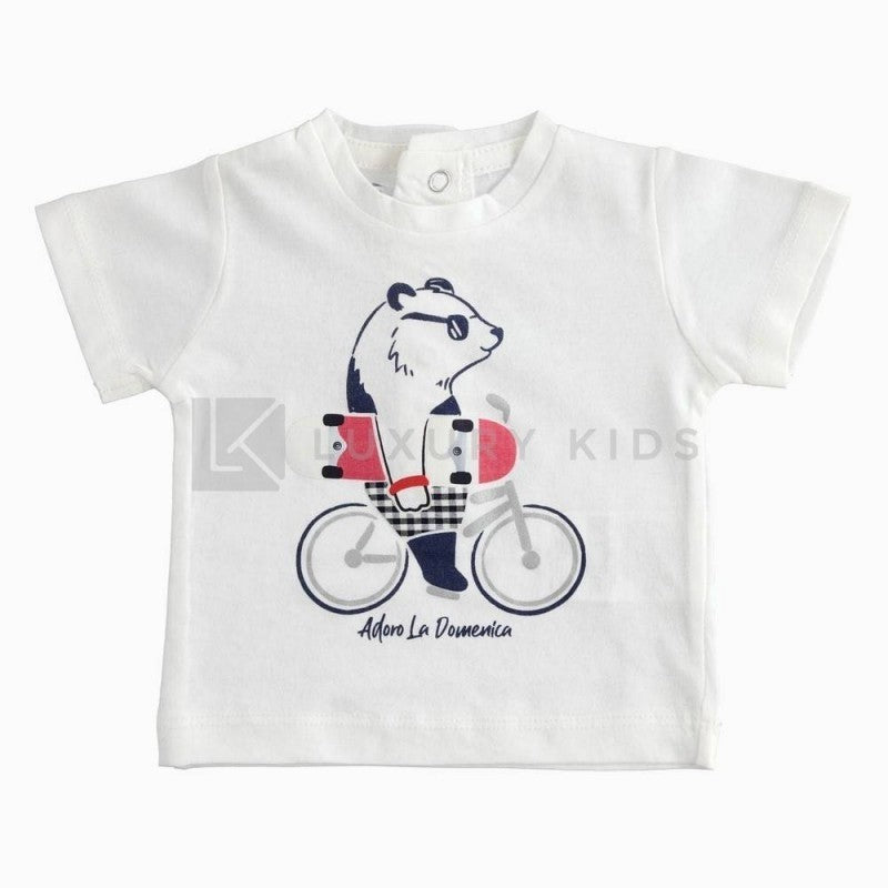 T-shirt neonato a manica corta in tessuto 100% cotone. Modello girocollo, comoda apertura dietro e simpatica stampa panda che va in bicicletta portando il suo skateboard, realizzato in fantasia check
