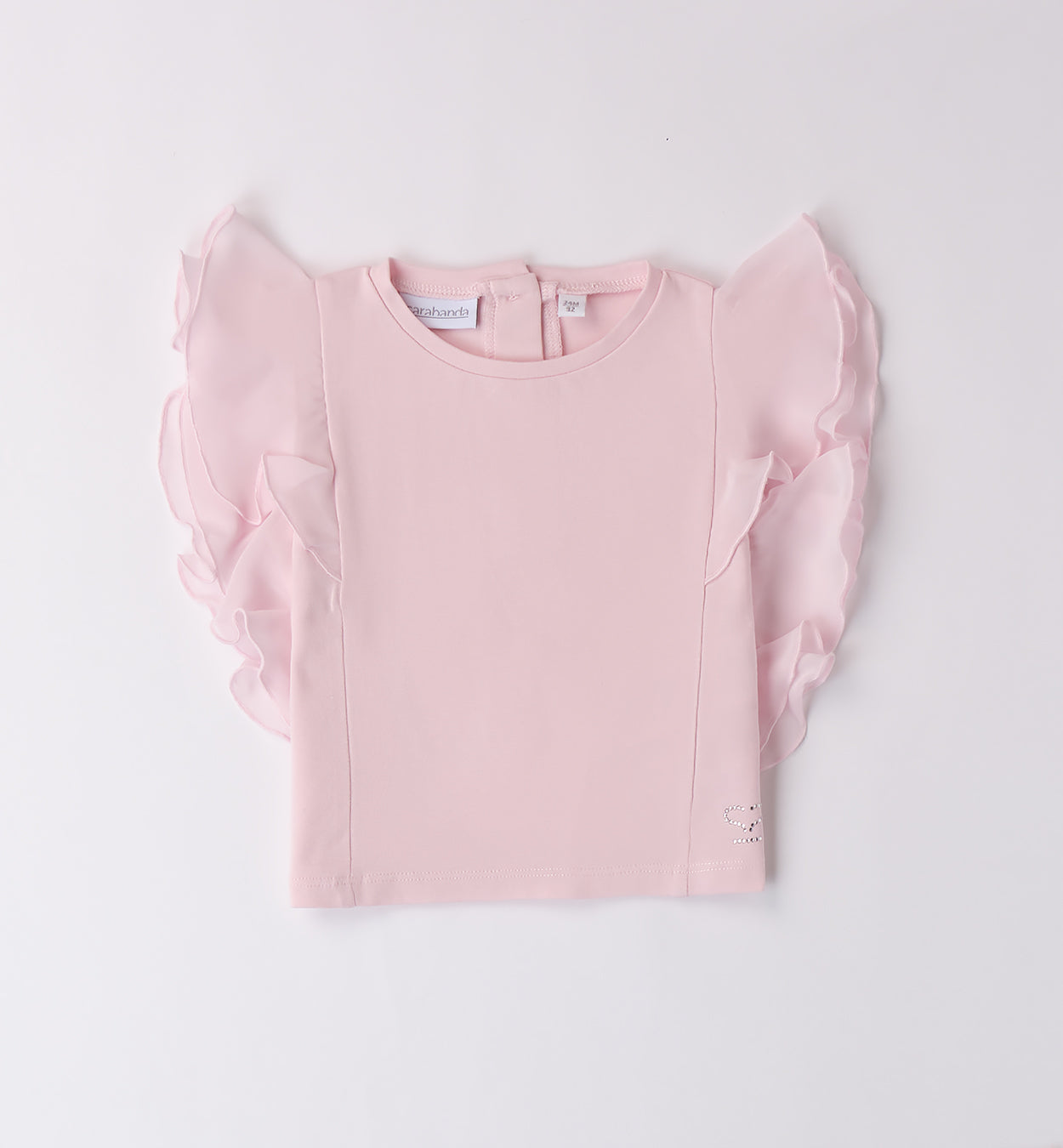 T-shirt Sarabanda per bambina realizzata in jersey stretch di cotone. Il modello presenta apertura sul retro con bottoni e maniche con ruches.