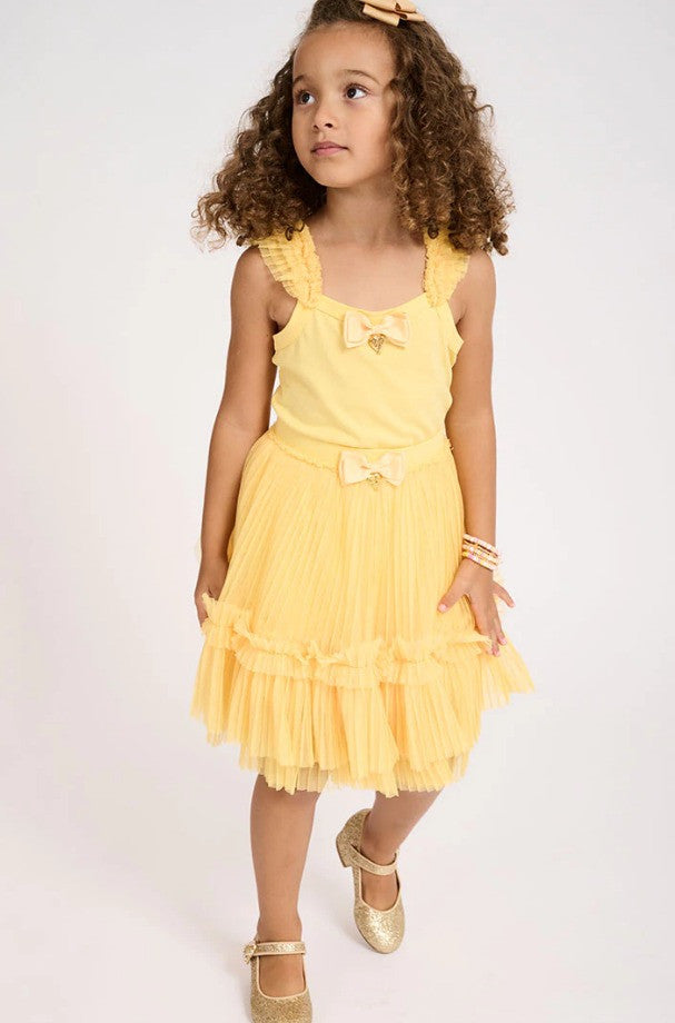 Realizzata nel più morbido misto cotone in giallo sole, completa del nostro caratteristico fiocco e del ciondolo a forma di cuore dorato al centro della scollatura.