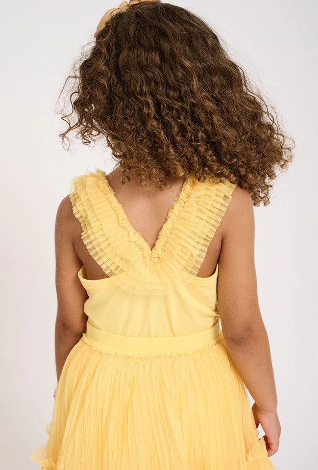 Elegante canotta estiva con strati di morbido tulle plissettato che si adatta perfettamente alle spalle.
