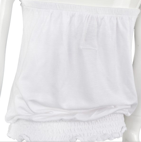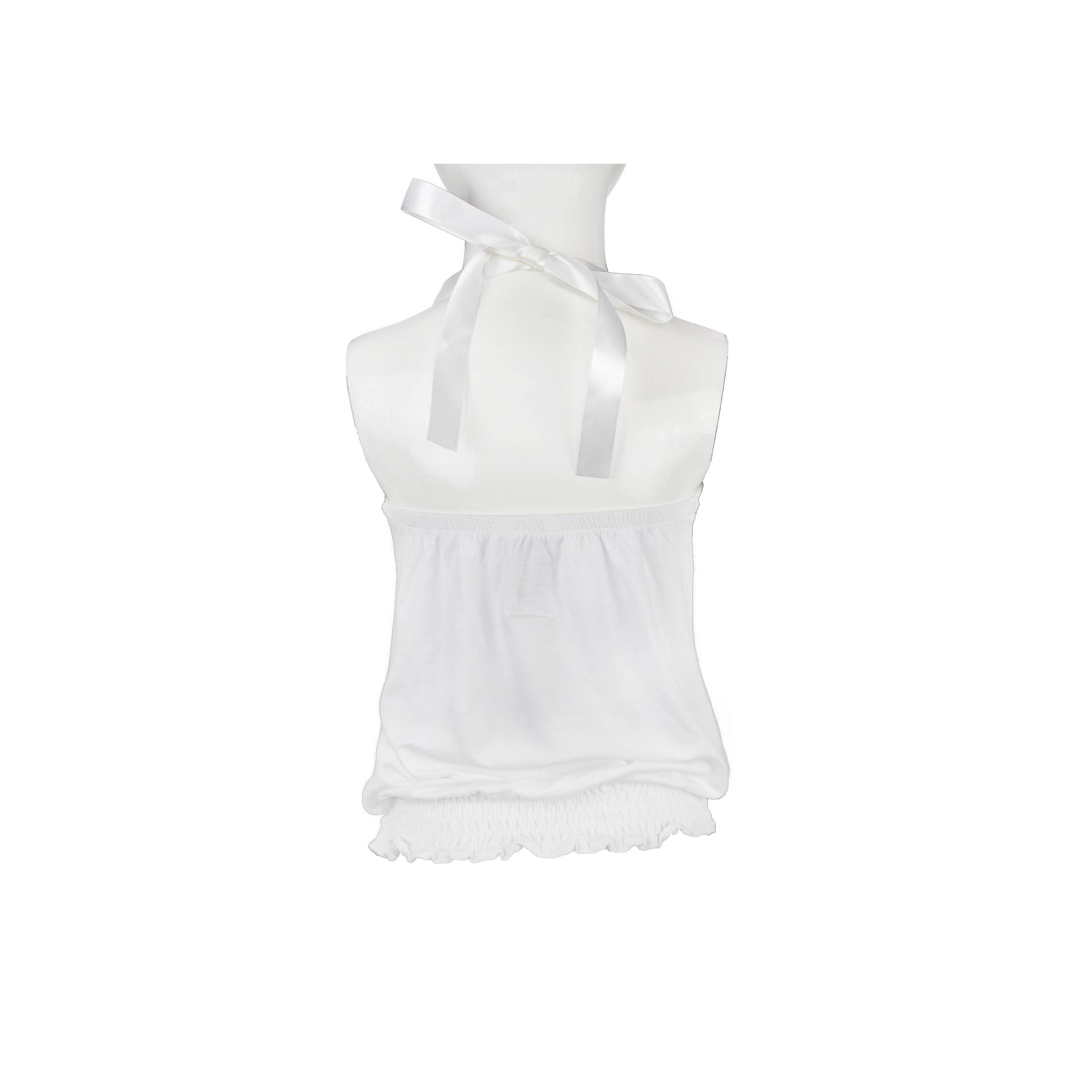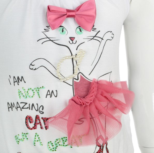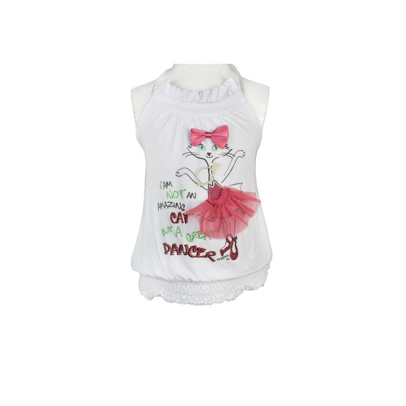 Top smanicato bianco in tinta unita con stampa gattino ed applicazioni sul davanti