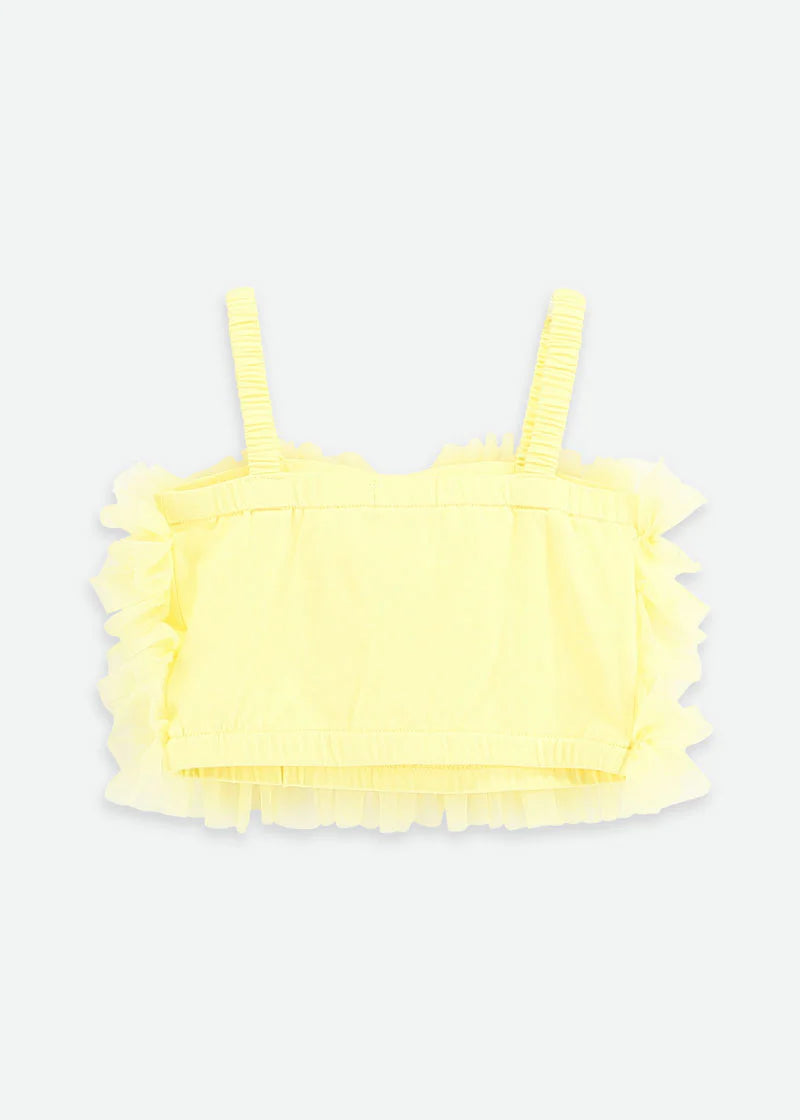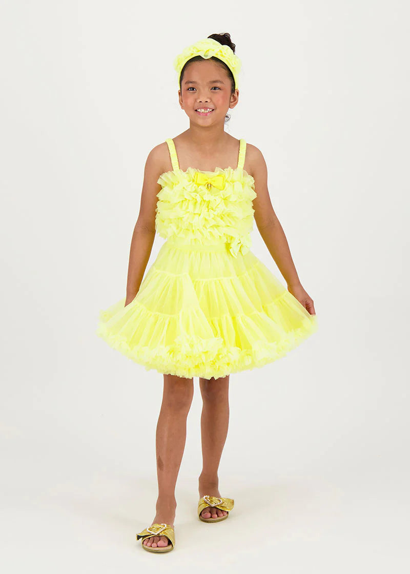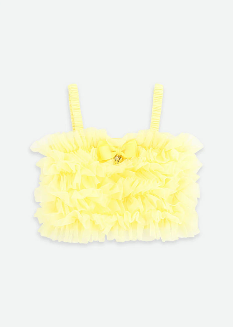 Top corto con volant in sorbetto realizzato con più strati di pizzo di tulle. Ha un grazioso fiocco sul davanti ed è abbinato al colore del nostro iconico tutù folletto nella stessa tonalità. Completato con il nostro caratteristico fiocco e il ciondolo a cuore dorato.