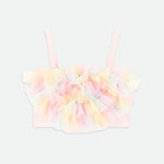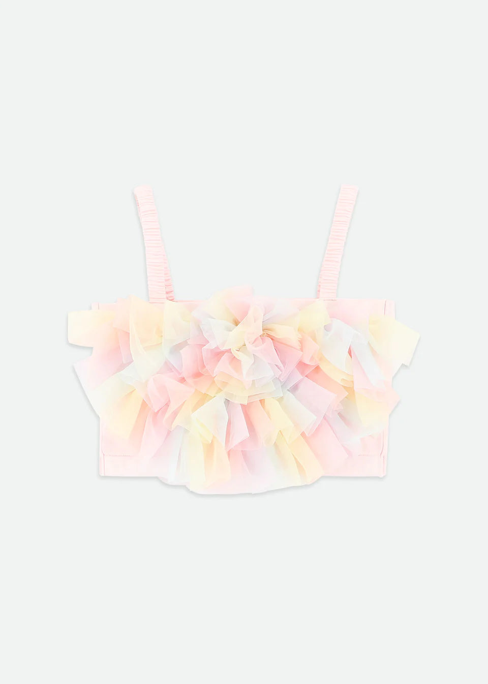 Top corto con volant arcobaleno realizzato con più strati di pizzo di tulle. Presenta un grazioso motivo a rosetta sul davanti ed è abbinato ai nostri iconici tutù pixie nella stessa tonalità.