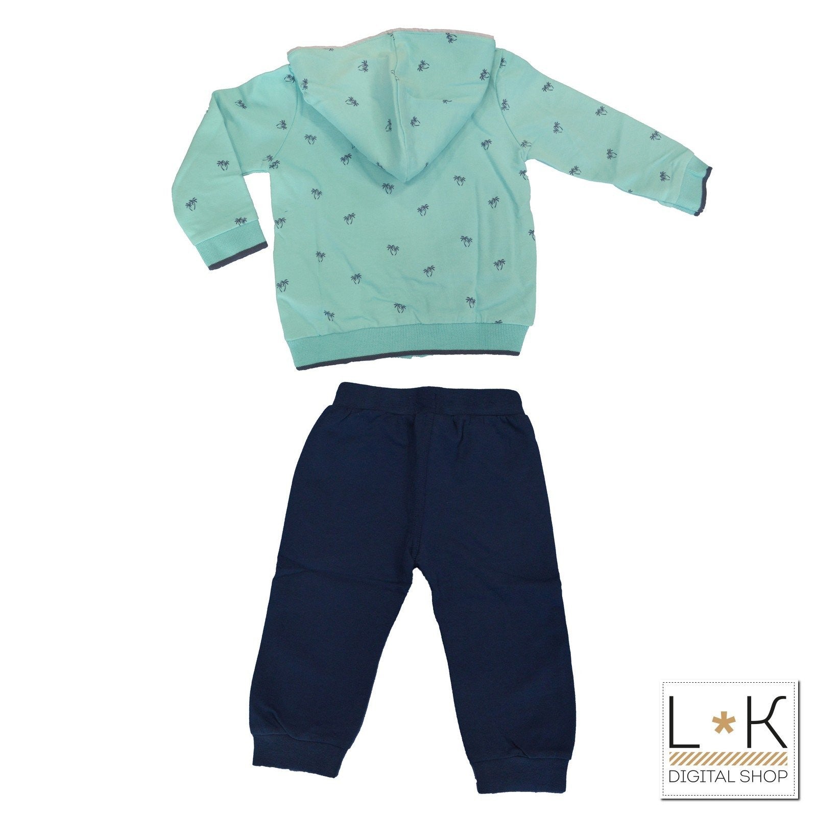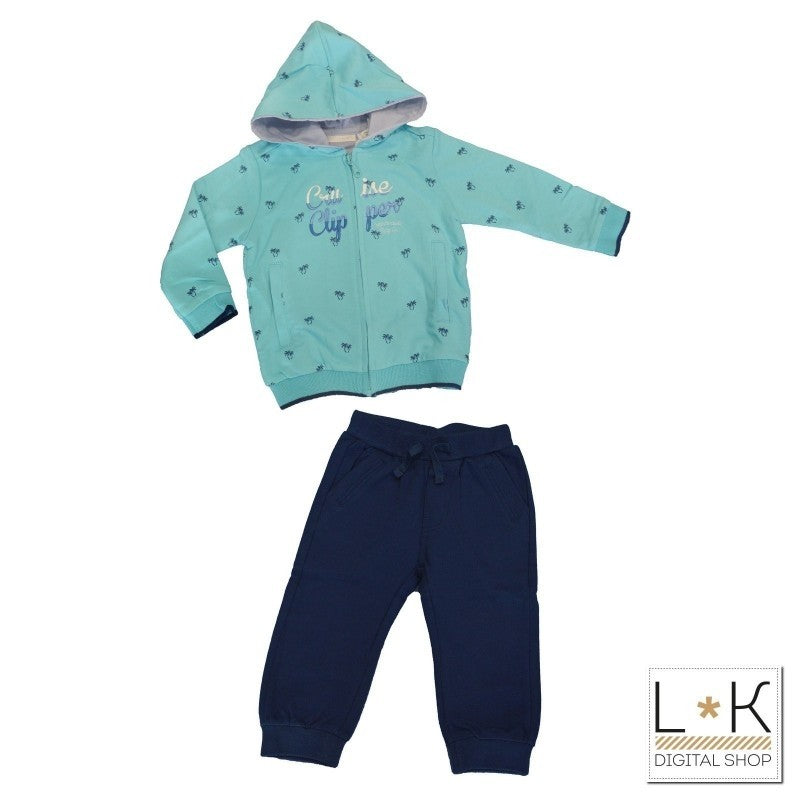 Tuta con Cappuccio in Cotone, Chiusura con Zip e Ricamo sul petto con Stampa di Palme Blu.