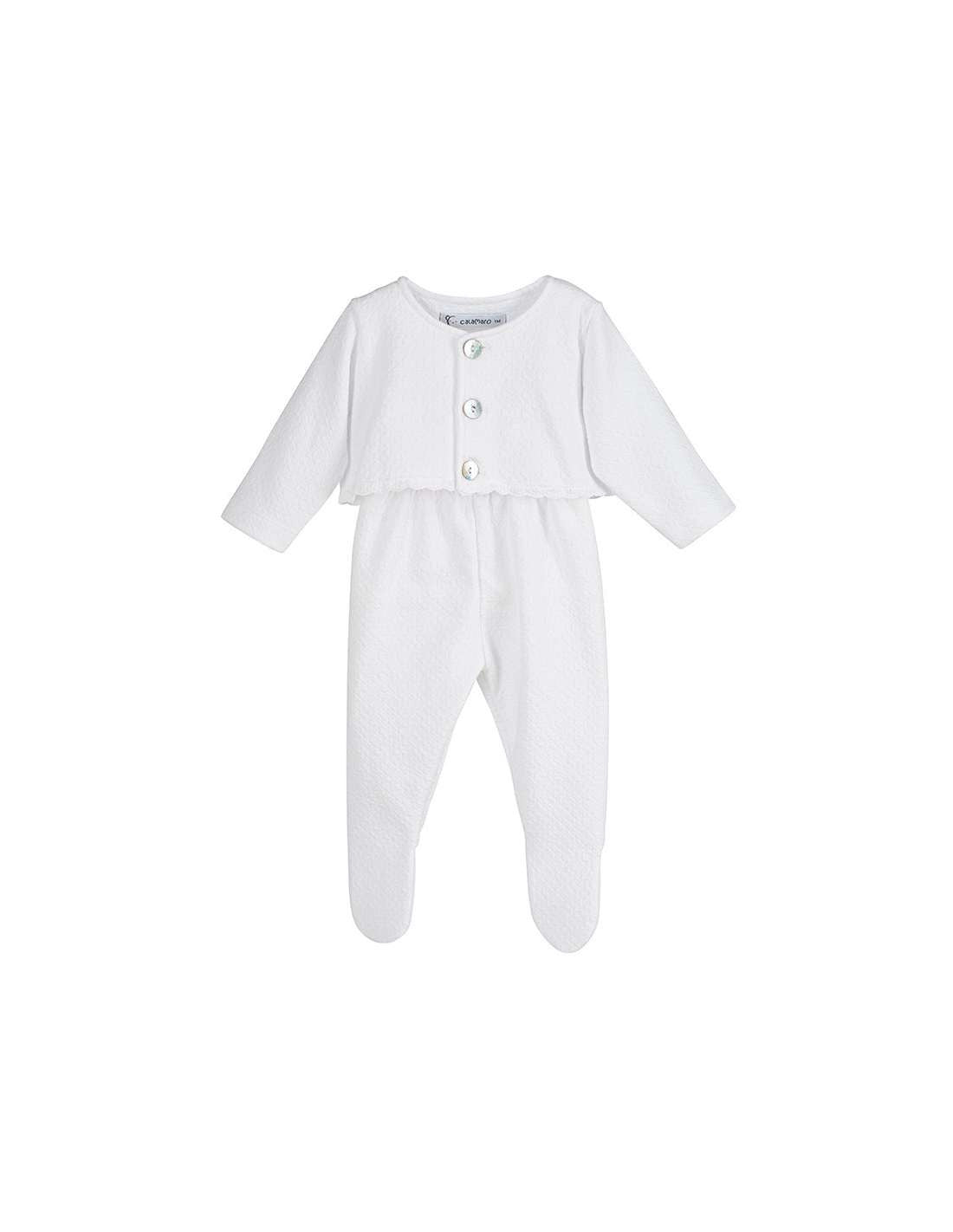 Tutina due pezzi con maglia in caldo cotone maniche lunghe con bottoni frontali e pantalone salopette con bretelle ed elastico in vita e alle caviglia.