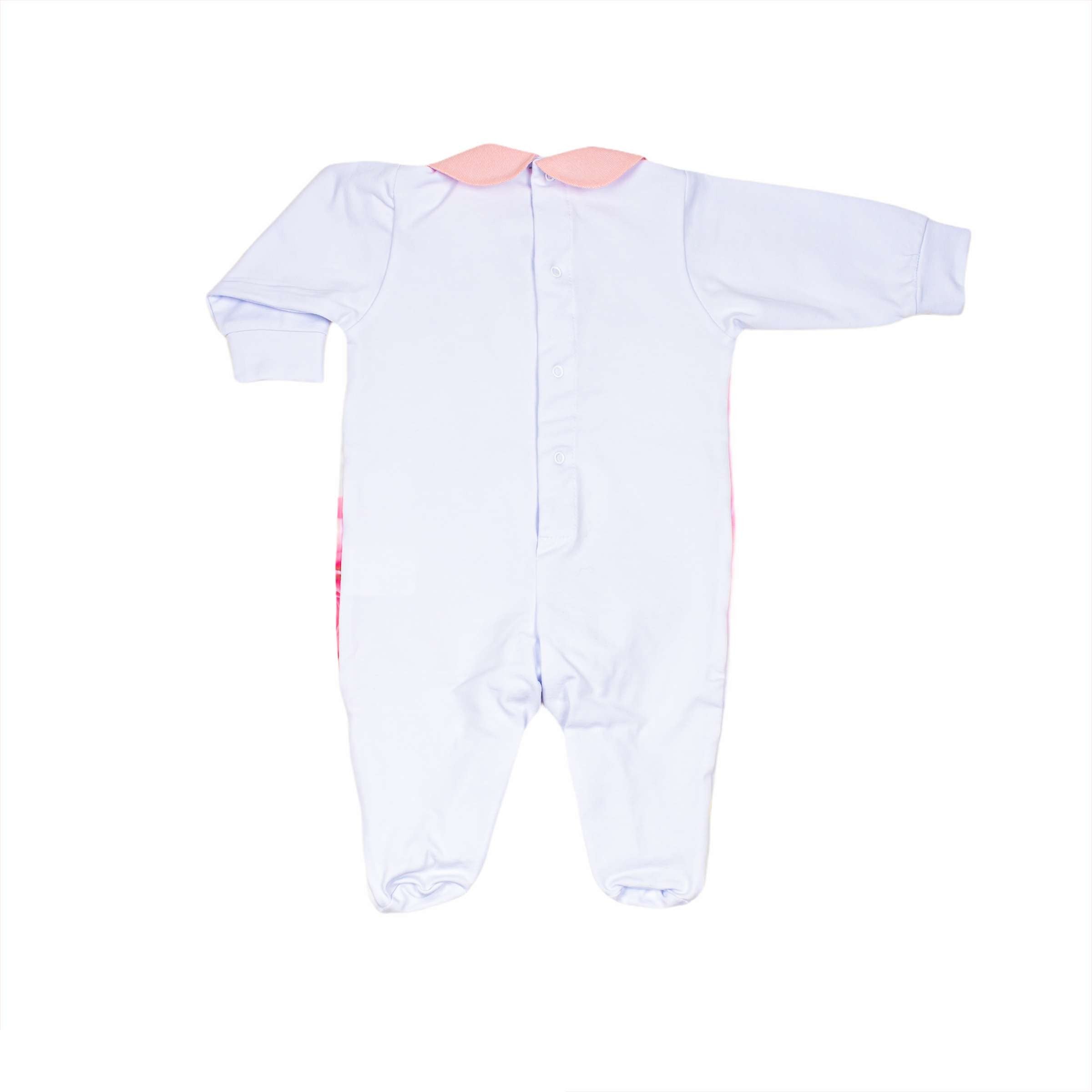 Tutina In Cotone Bianca, Fascia In Vita Impreziosita Da Fiocchetto E Colletto In Lurex Rosa. Nella Parte Inferiore Doppiata Con Organza Con Stampe Di Foglie e Rose.
