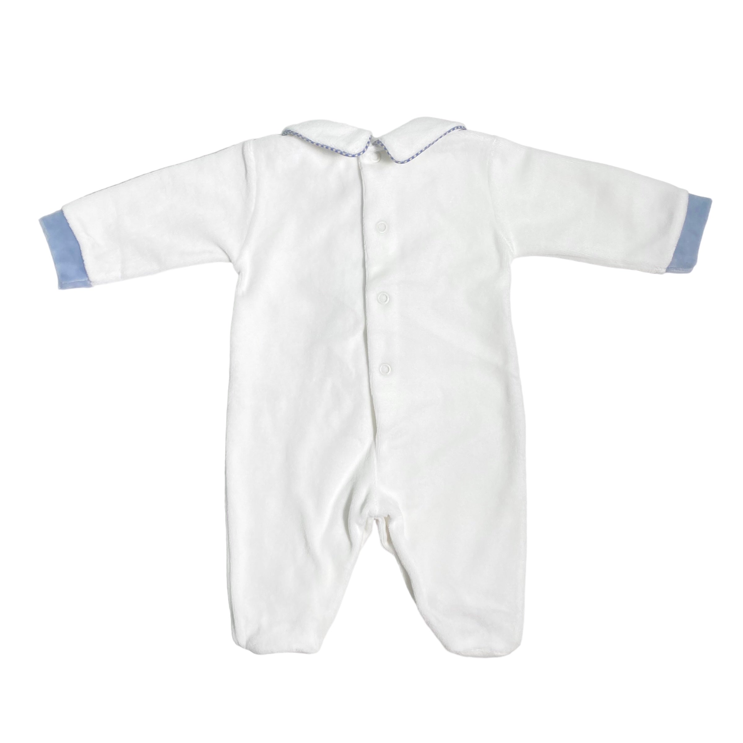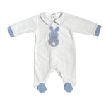 Tutina intera in ciniglia panna, con applicazione di coniglio in ecopelliccia celeste polvere.