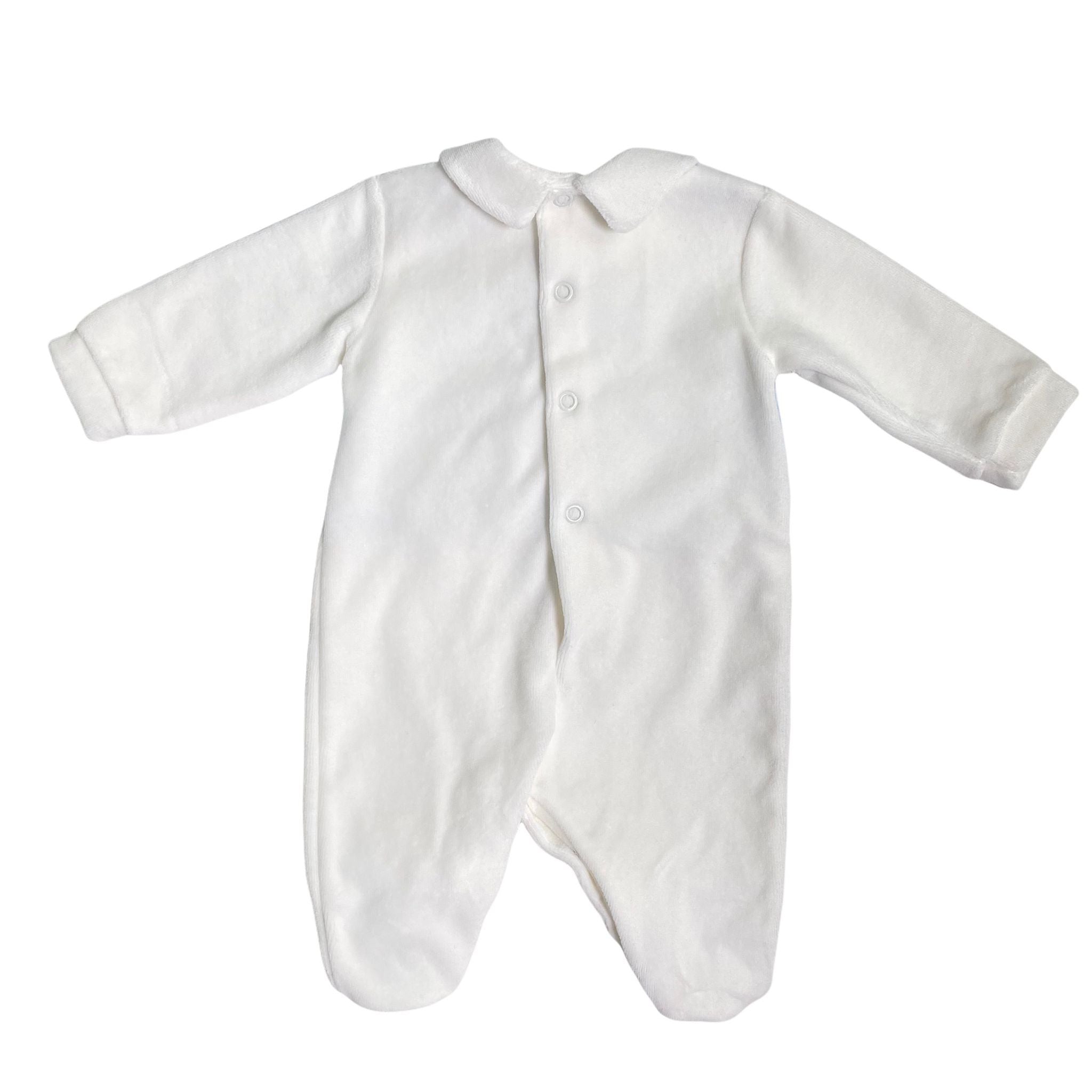 Tutina intera con piedini e maniche lunghe, in ciniglia con finto panciotto e colletto camicia, con chiusura al cavallo e sul retro con bottoni a pressione.