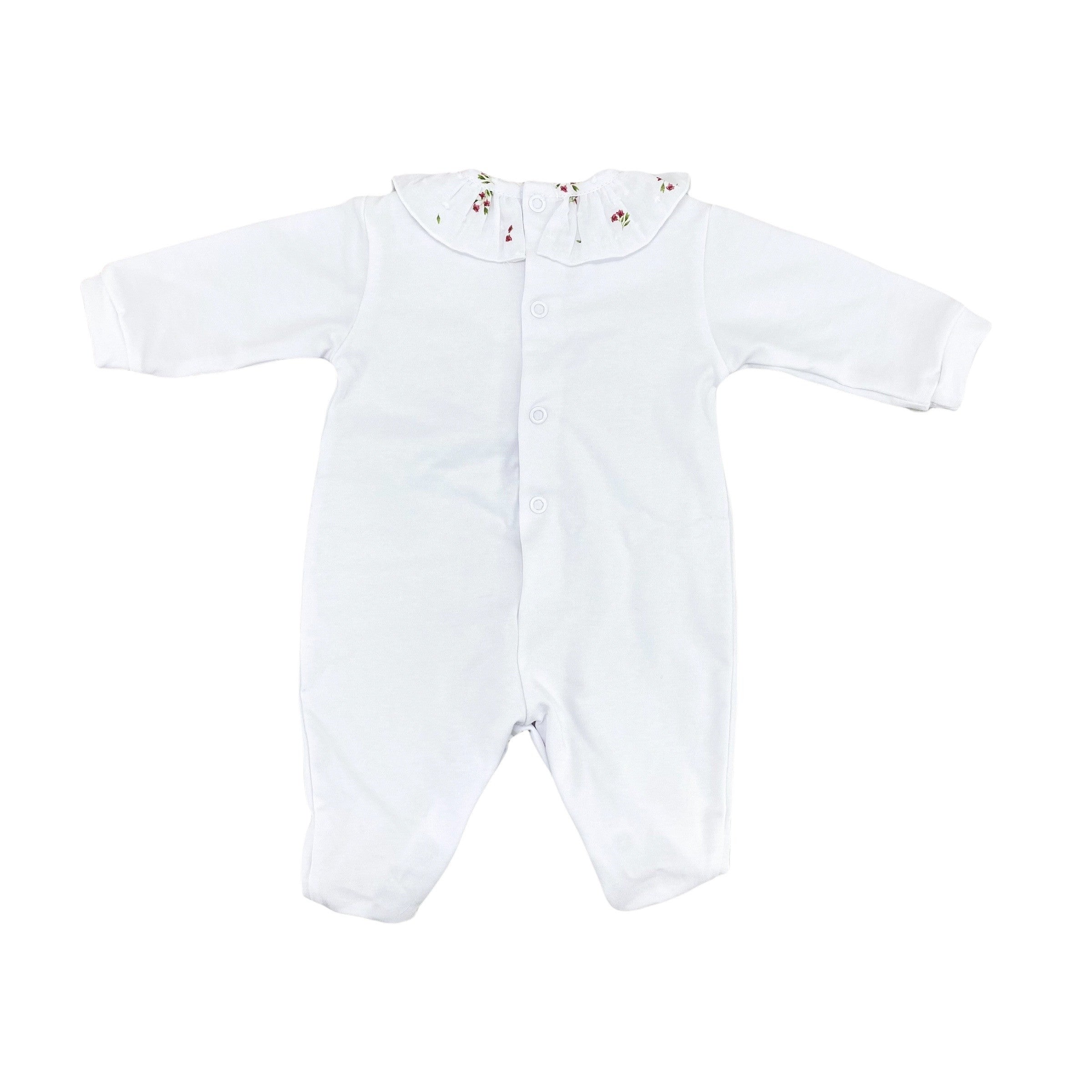Tutina intera in cotone bianca, con applicazione di fiocco a quadri rosso sul davanti e collo rotondo fantasia provenzale.